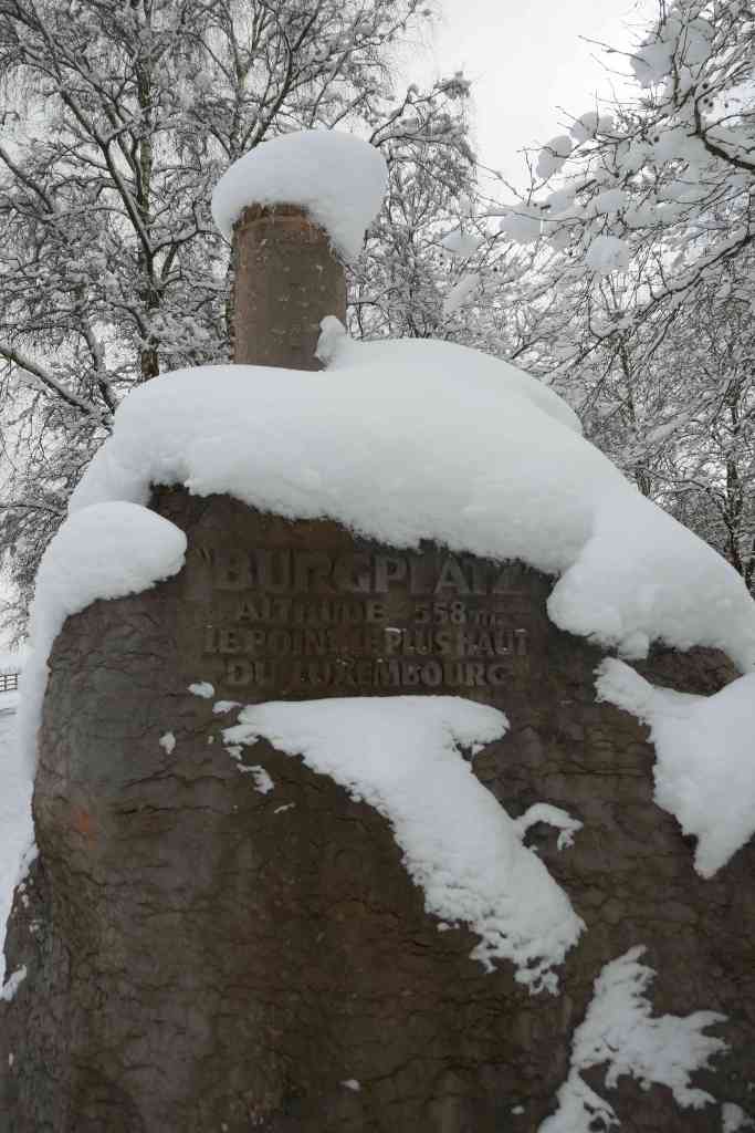 Having come all this way only to find out we weren’t on the roof of Luxembourg after all, we immediately set off to conquer the rightful claim to this prestigious throne. Oddly, almost exactly half-way between the two places we passed another snow-covered monument also claiming to be the Buergplaz, again with different spelling (“Burgplatz” this time) and a slightly different altitude (558m). This was becoming confusing…