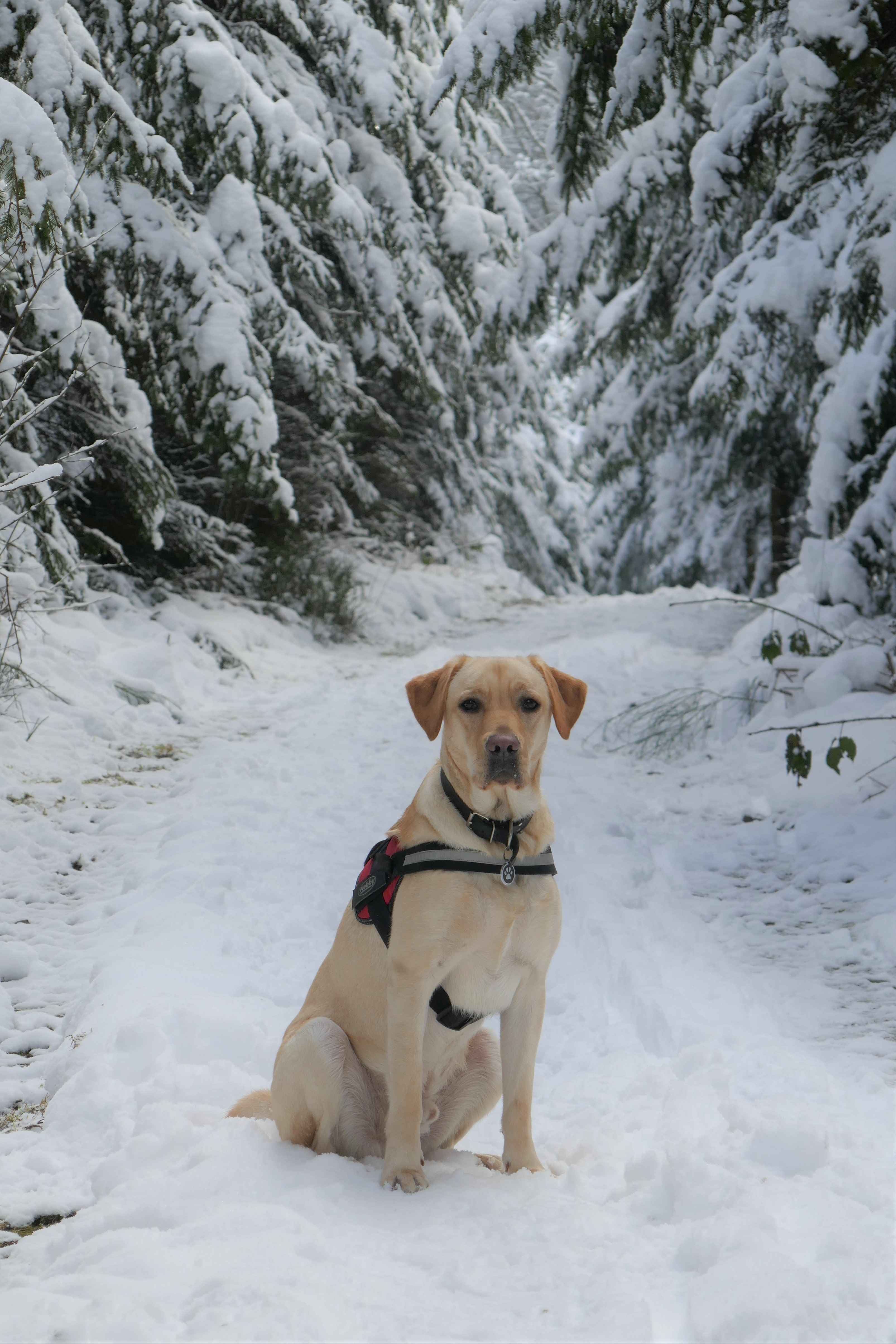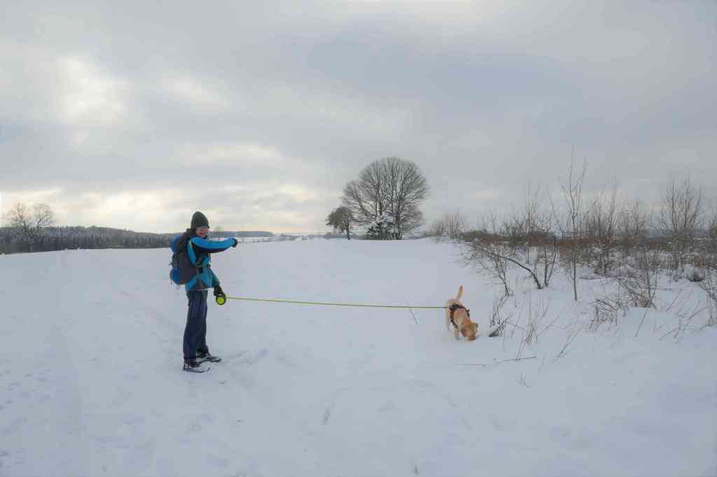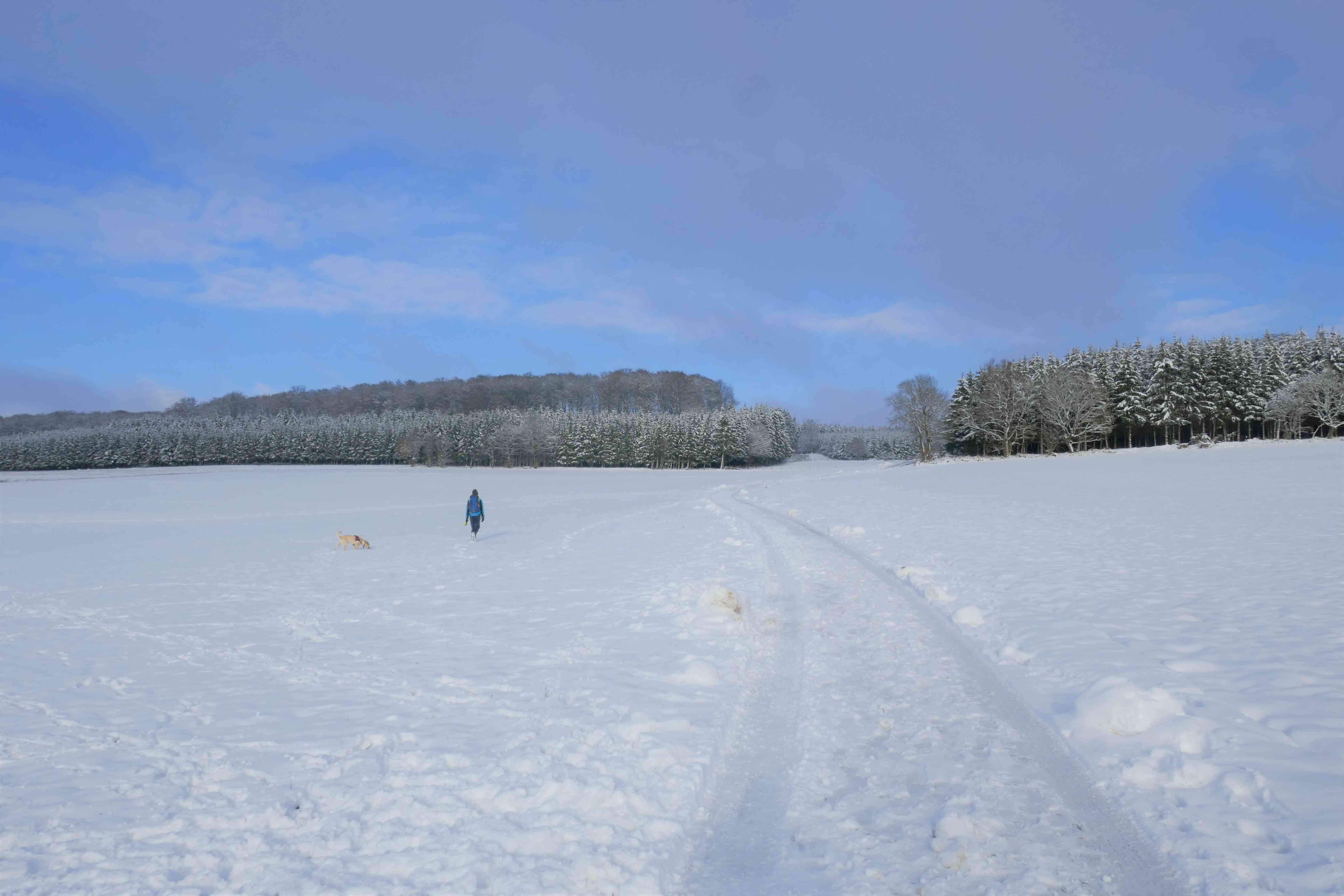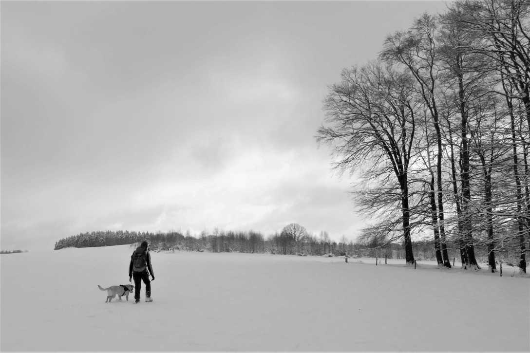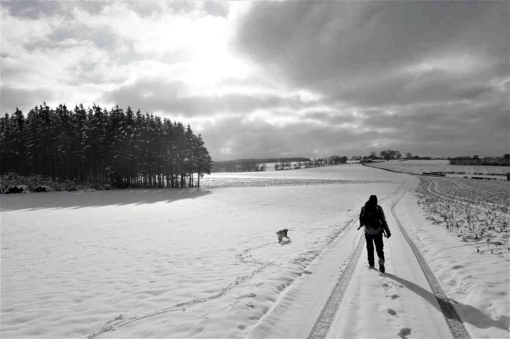 But as we trudged through boot-high virgin snow up towards Kneiff, we became increasingly confident that we were finally in the correct place. The wind had died down, allowing us to enjoy the 360° views all around Luxembourg’s true highest point. The only problem was finding exactly where it was: there is, apparently, a white stone marking the place under all that snow, but we clearly had no chance of locating it, not today. One small rise did seem to be higher than all the others, but it turned out to be a 1m high drift that the dog was gleefully swallowed into before reappearing, a joyful, bounding mass of white powder and golden fur.