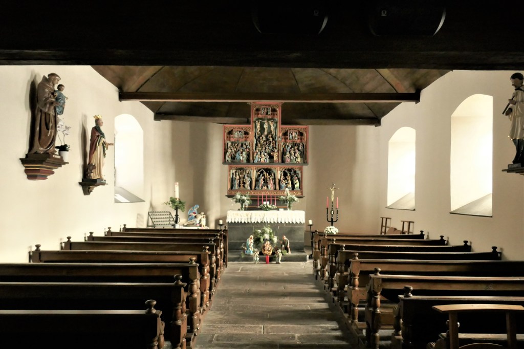 Helzer Klaus has been a place of worship and reverence for hundreds – if not thousands – of years. The presence of a natural spring, a burial mound and a Roman road nearby all provide historical evidence of this, just in case you somehow don’t feel the spiritual vibes that seep from the whitewashed walls and whispering trees. It probably turned Christian under Charlemagne in the 9th century, but it wasn’t until 1474, under orders from none other than the Pope himself, that a larger chapel was built. Soon afterwards it was adorned with a magnificent carved altar; the original is now in the larger church in the nearby village (a point somehow overlooked by the otherwise excellent English audio presentation inside the chapel…), but there is still a replica to admire in Helzer Klaus itself: