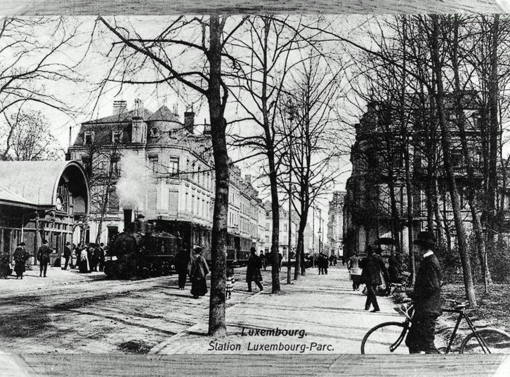 I saw this wonderful old photo recently of a steam engine pulling into a stop, slap-bang in the middle of a busy road in Luxembourg City. You may still recognise this place as “Charly’s Gare” – a buzzing transport hub even today.