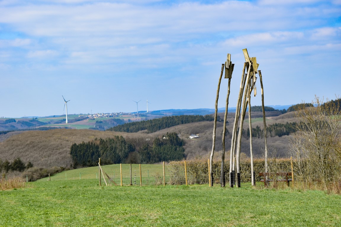 Giant windchimes gently tinkle and giant windmills silently turn in the fresh breeze. We haven’t hiked more than a few hundred metres on the Hoscheid plateau, but we are already at the highest point for today.