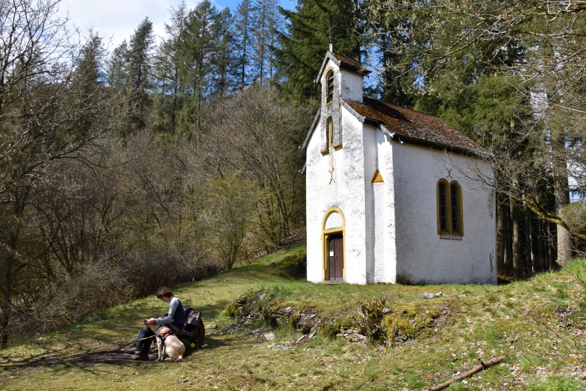 Safely down in the absurdly beautiful Schlënner valley, and it was time for lunch at a spot we already knew well from previous hikes – the St Michel Chapel: a whitewashed fairy-tale in the woods.
