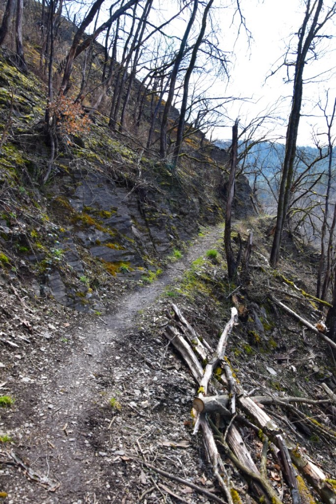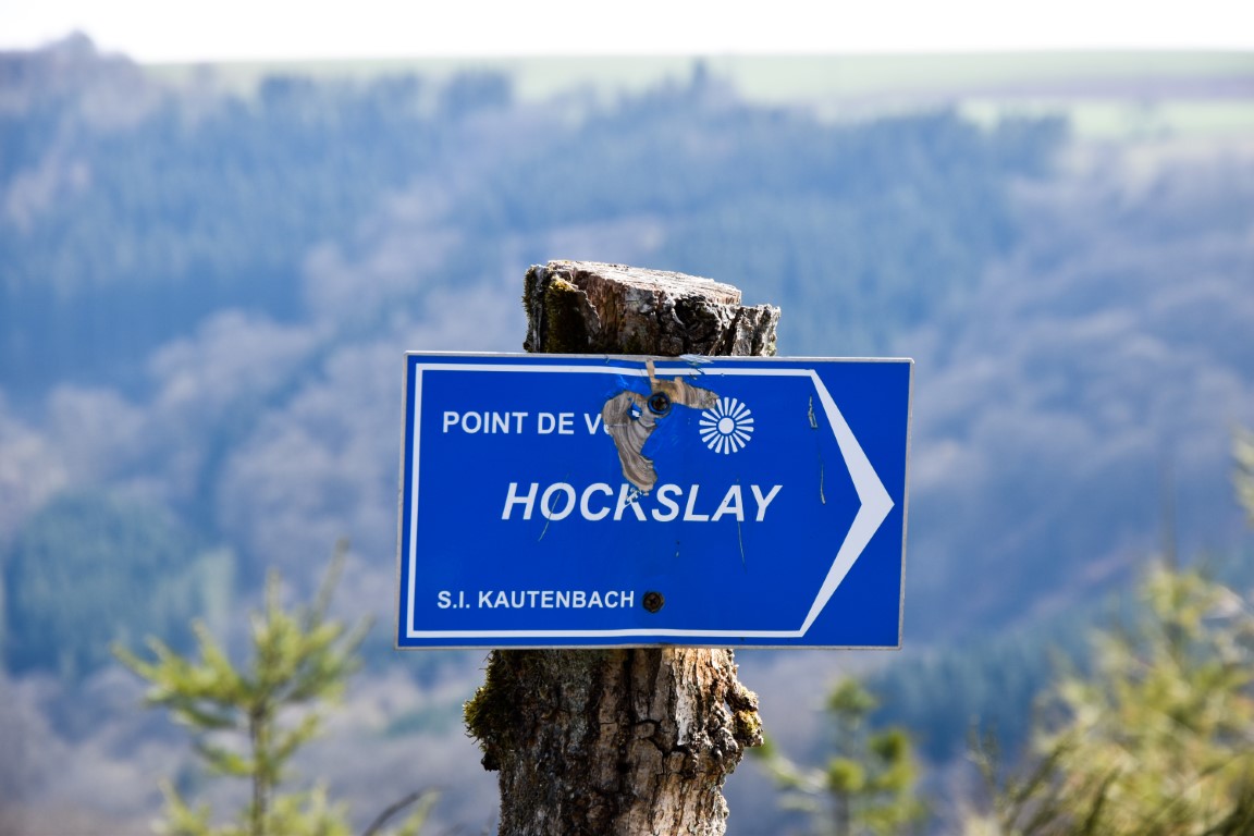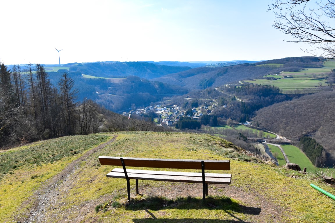 The descents may be short and sharp, but the uphill sections are long and relatively gentle – a respite for the knees. We seemed to reach the next viewpoint – the Hockslee – rather quickly, and from this rocky perch above the Wiltz valley one can already see the destination for the day: Kautenbach.