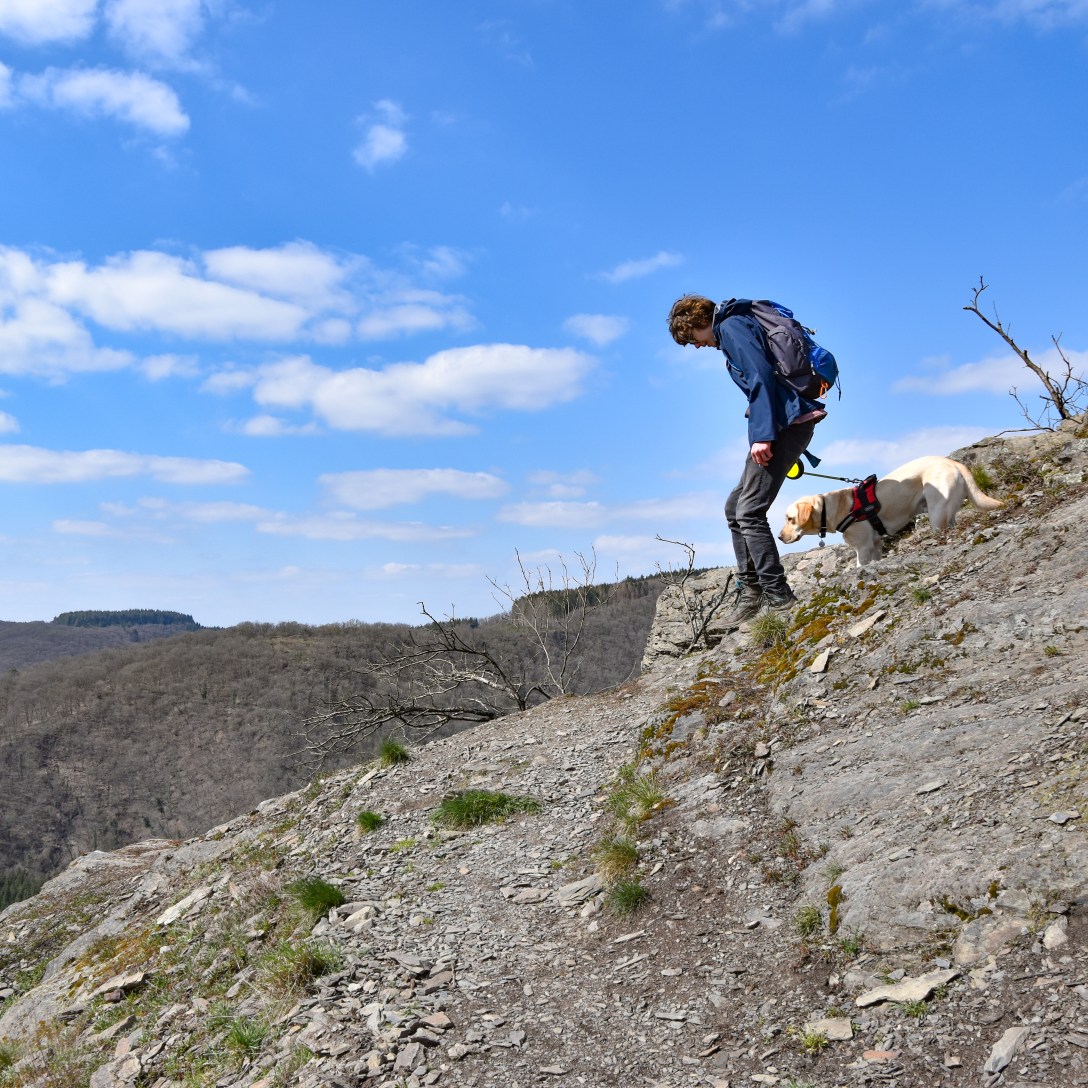 The descents may be short and sharp, but the uphill sections are long and relatively gentle – a respite for the knees. We seemed to reach the next viewpoint – the Hockslee – rather quickly, and from this rocky perch above the Wiltz valley one can already see the destination for the day: Kautenbach.