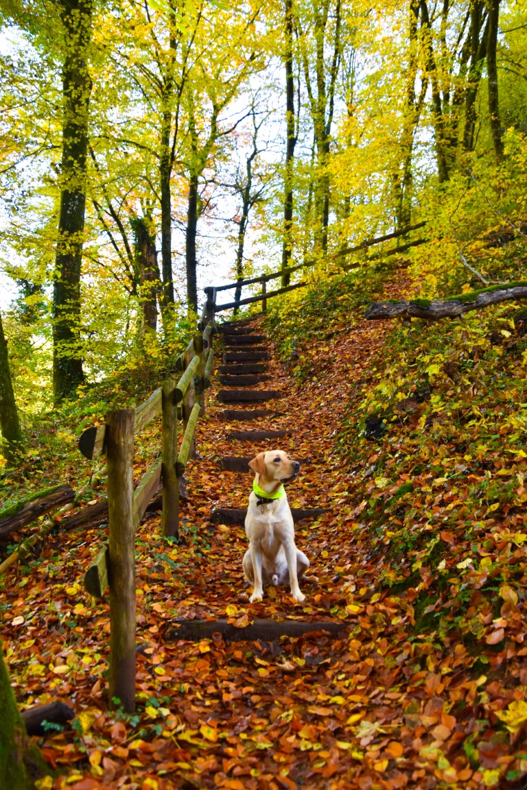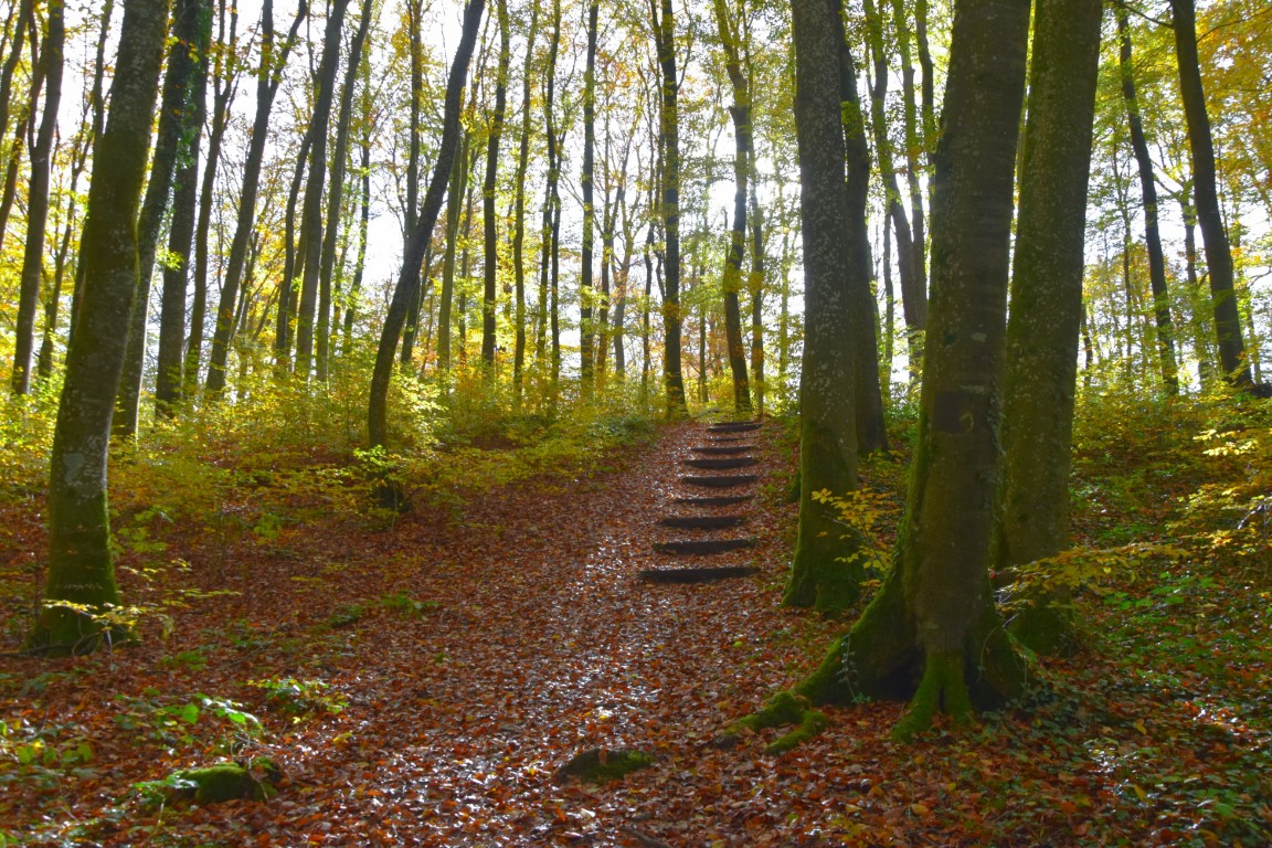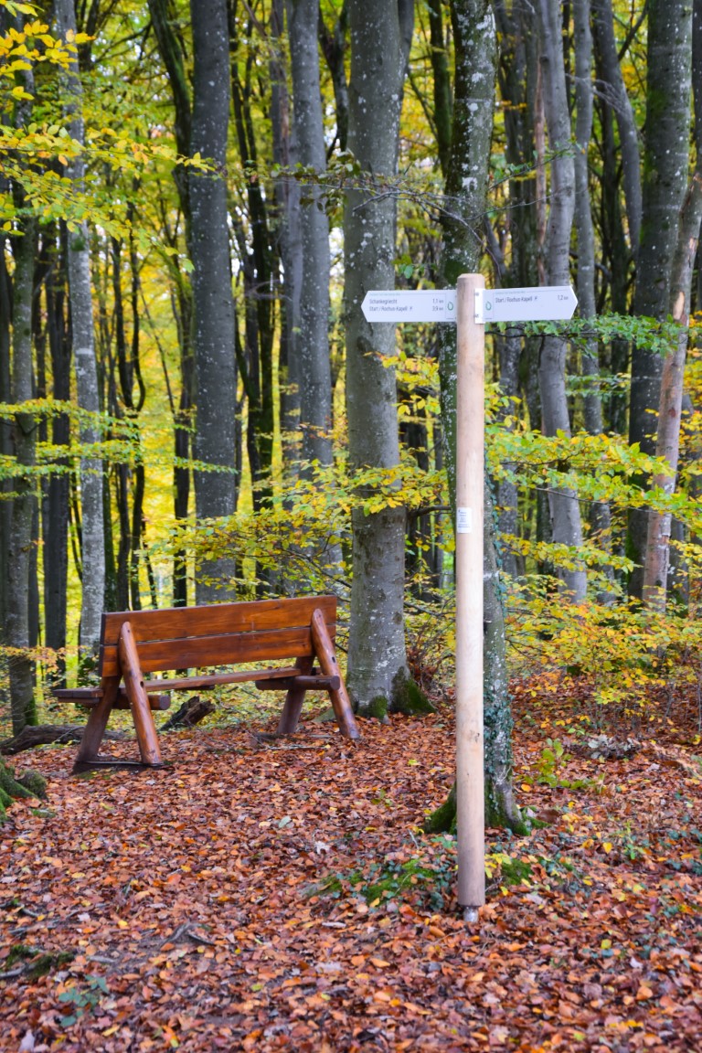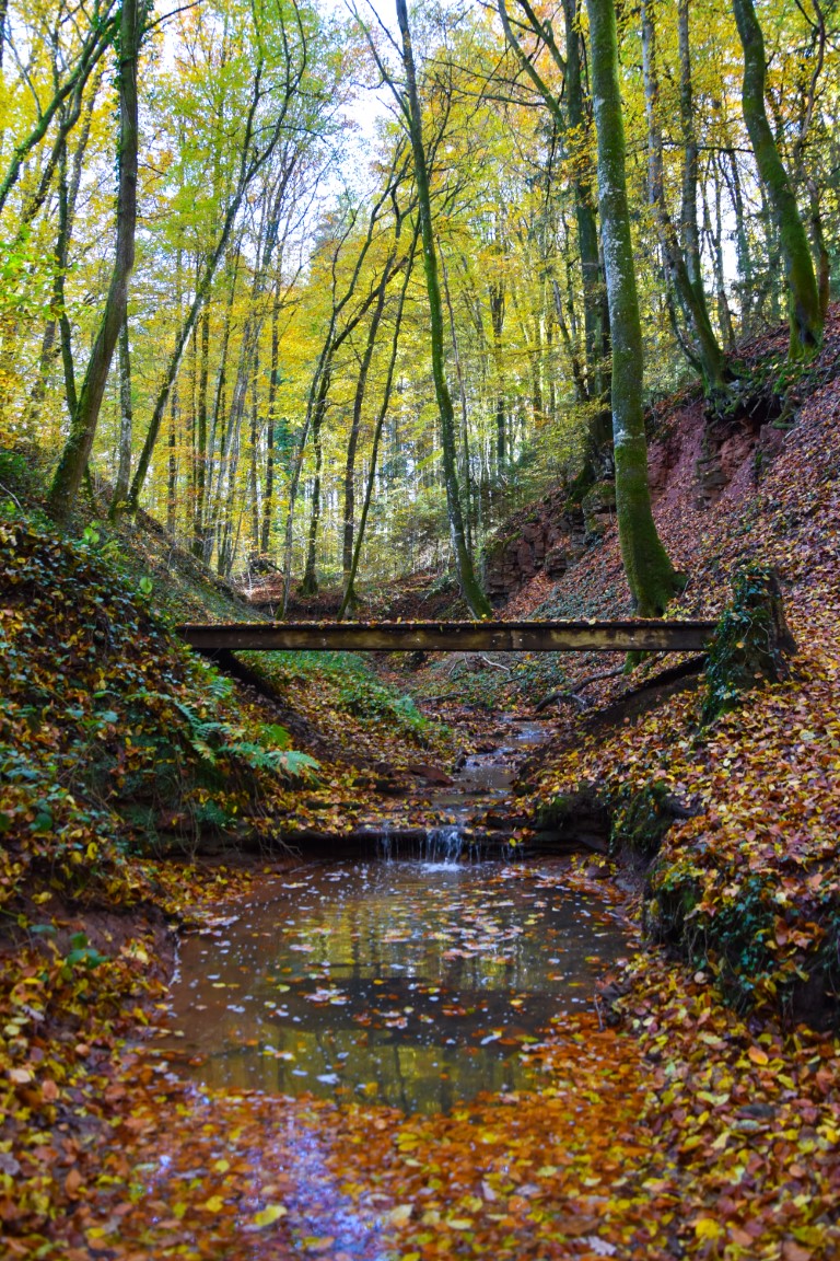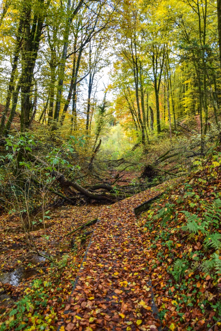 The Auto-Pédéstre (“AP”) Reimberg has recently been “upgraded” and re-branded as the very first “Guttland Trail“… and it’s exactly what you’d expect to find in the Guttland: tranquil beech forest, babbling streams and the occasional view over rolling farmland, gorgeously illuminated during our visit by the annual autumnal colour show.