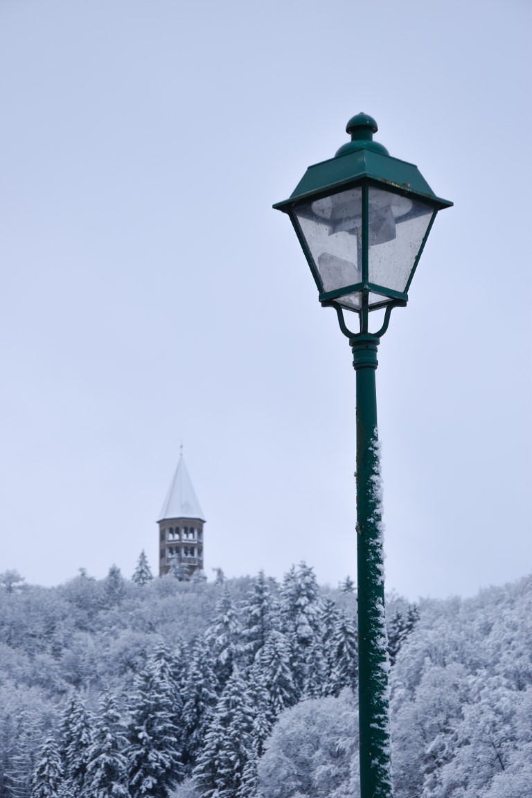 Back on the trail, the impressive “KlĂ«ppelkrich” monument (right) – remembering local “peasants” killed in an uprising against French occupation in the late 18th century – marks the beginning of the steep and icy descent back towards Clervaux, where plenty of cosy cafĂ©s and good restaurants await those with weary legs and a newly-satisfied soul.