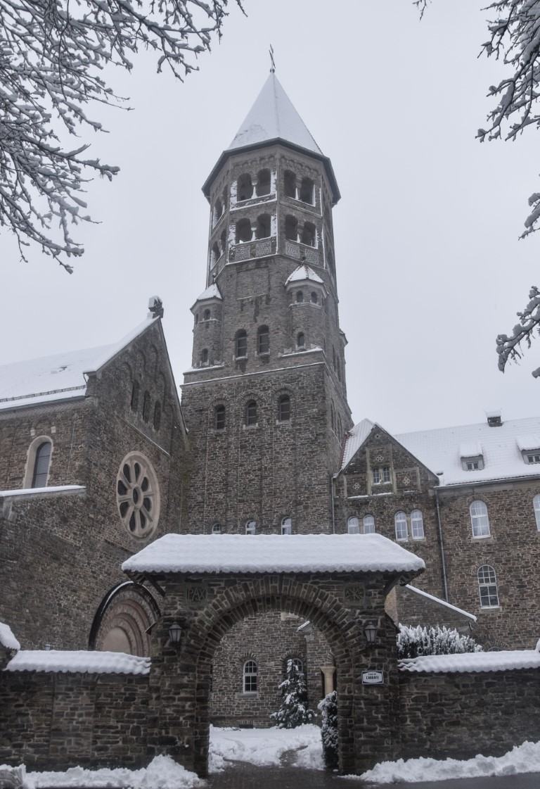 If I’m feeling critical, I could say that – wildlife aside – there really isn’t much to see between Eselborn and Clervaux. This section of the trail could have been any other hiking path in this part of the Ardennes: calm, pleasant, a bit lumpy… and occasionally very wet (wear hiking boots for this one folks, even in summer). Oddly, the Eislek Pad technically doesn’t go to Clervaux’s most impressive monument either – the imposing neo-Romanesque bulk of the Abbey of St Maurice and St Maur. We simply couldn’t come all this way without getting a closer look, so took a short (200m, signposted) detour to the main entrance… and gazed skywards.