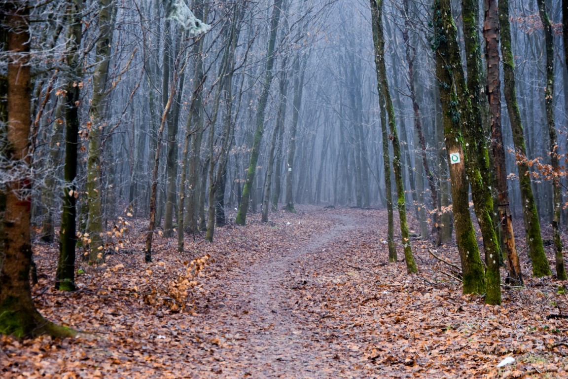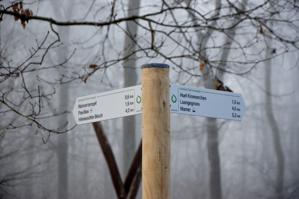 It was all foggy and mysterious up on the “Guttland Trail Fuussepad” this morning. This all-new hiking trail packs a lot into its 11.2km, from impressive Roman remains to the wide-open meadows of the Steinsel plateau. Most of the trail, however, meanders gently on natural paths through expansive beech forest… leading you tenderly to one of the most romantic “pavilion” viewpoints in Luxembourg.