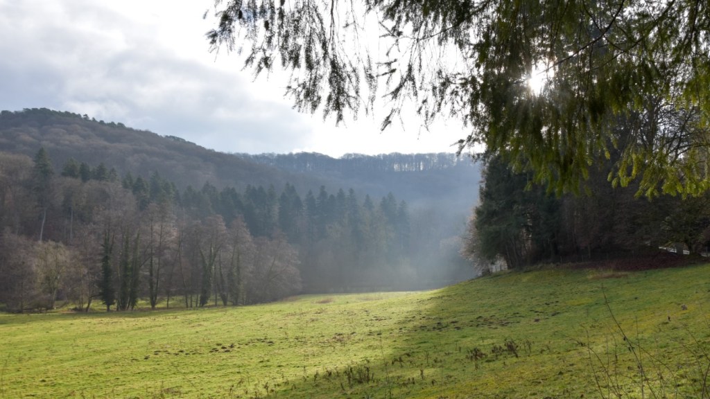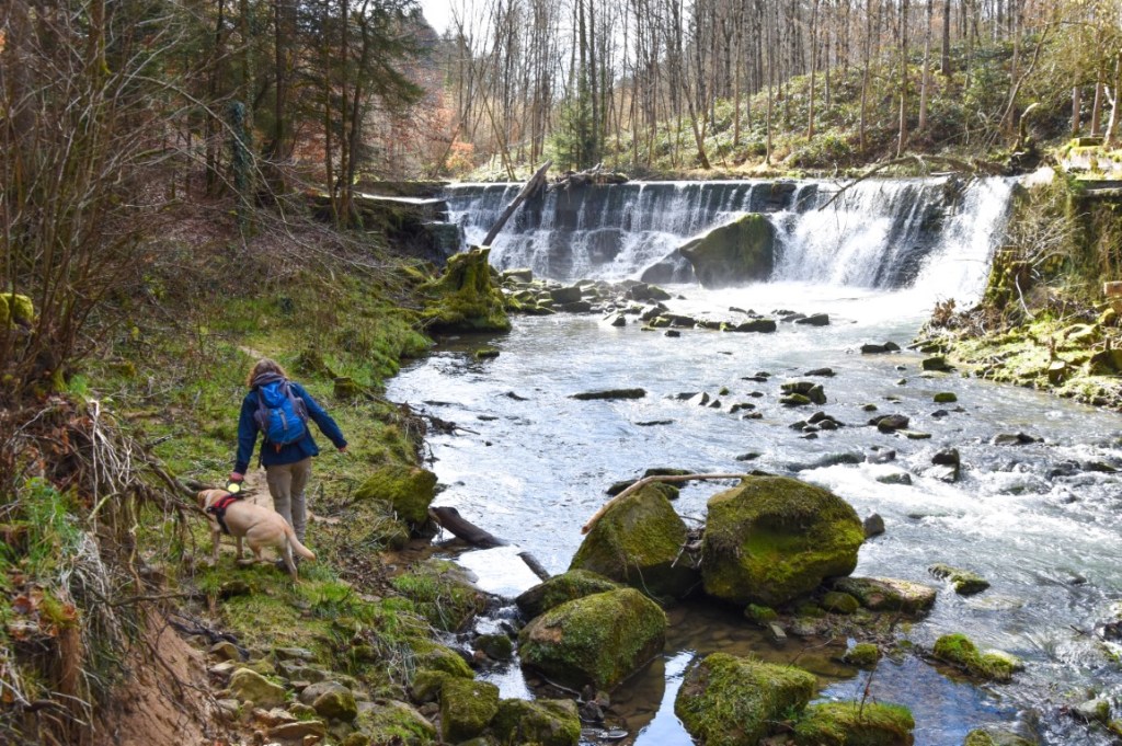 The traditional starting point for this hike is the popular tourist centre of Heringer Millen (Bus 470, plenty of free parking available), but we decided to tackle it a different way, starting at Vugelsmillen (Buses 414, 502, 848 and couple of others; a few on-road parking spots available). In this way, we saved the best bits of the tour – the rock formations around Berdorf and the Vugelsmillen waterfall (above) – until last, leaving us free to start our hike with the softer, simpler pleasures of a countryside stroll along Mullerthal Trail 3.