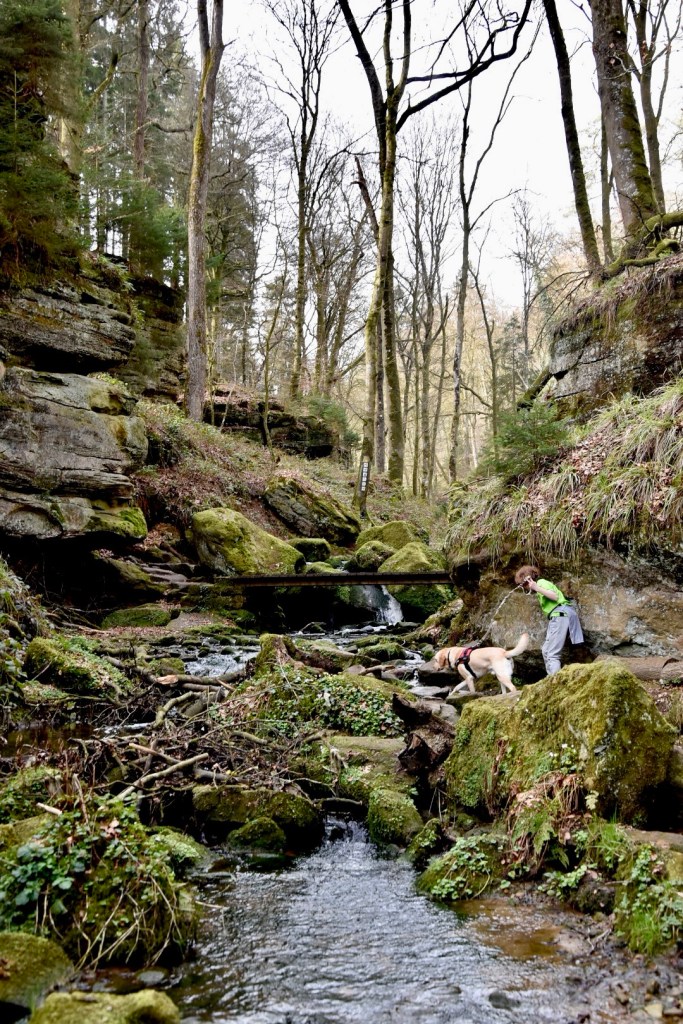 Another right turn and the scenery becomes – somewhat improbably – even better, as you follow the Haupeschbaach up towards the castle. This area frequently floods and the trail turns into quite an adventure in places; you’ll find yourself boulder-hopping across the stream on more than one occasion before the path finally rises high enough away from the water to provide some firmer footing. The kids will love it!
