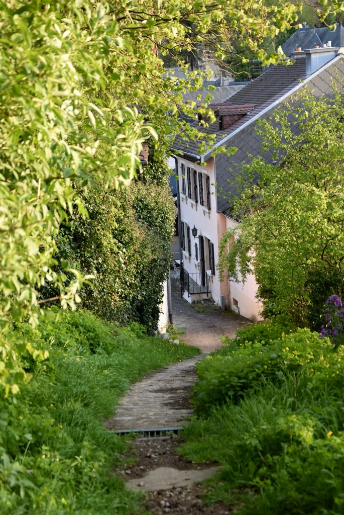 The trail quickly plunges back into woodland, a verdant canopy of fresh green leading towards the fourth viewpoint of the hike, the comically named “Mouk“. Whilst the vantage point at the bench is superb, it’s the views on the steep descent back down into the village that really steal the show.