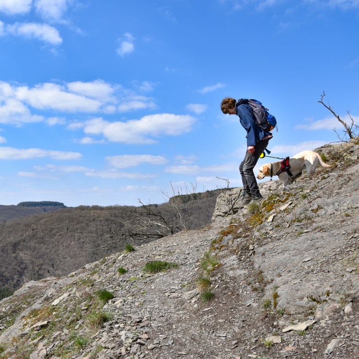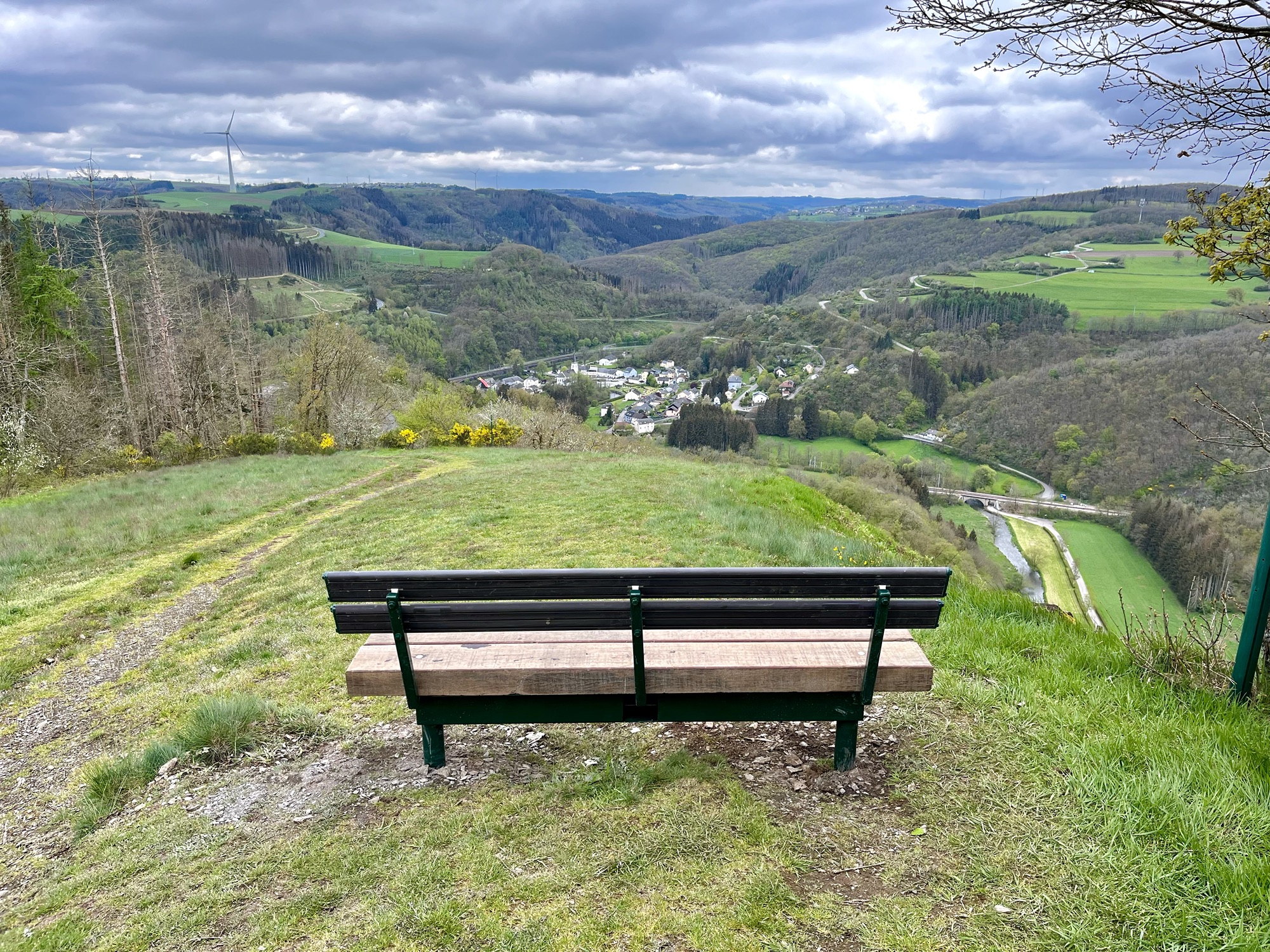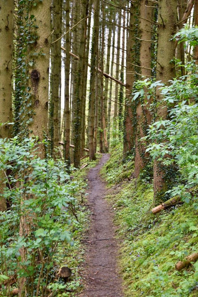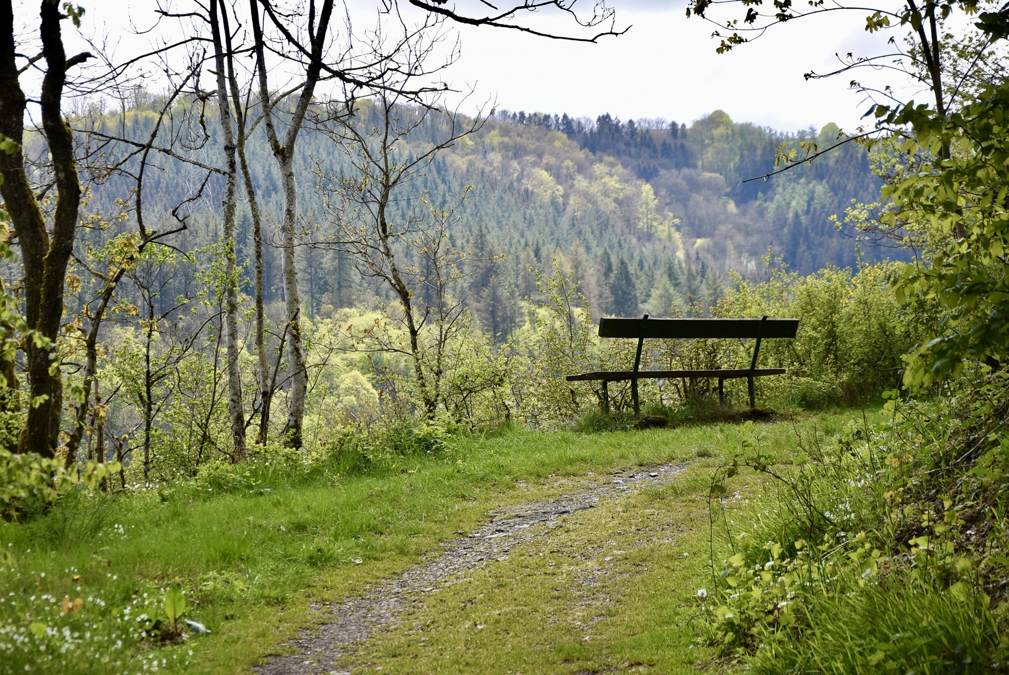 It’s an utterly gorgeous path, constantly weaving up and down, side to side, here and there through the romantic woods and abundance of spring wildflowers. After some spectacular views over Luxembourg’s most infamous ridge walk – the Molberlee (left above) – and up, up over an open plateau, the trail takes you to the cusp of another of the region’s famous “lee” ridges, the Hoflee. It’s time to descend once again.