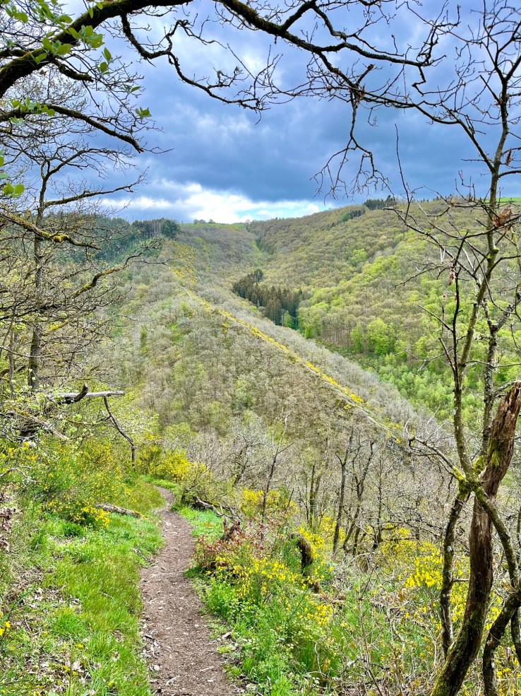 And what a “push” the Molberlee is! It may be just over 600 metres long, but, my goodness, this is arguably the best half-kilometre of hiking trail anywhere in Luxembourg. The comfortable world of forest and streams seemingly disappears under your feet, leaving only an exposed, narrow slate ridge and wind-beaten bushes for company. Upwards you climb, quickly, towards the level of the surrounding hills, rising brutally some 140 metres at an average gradient of well over 20%.