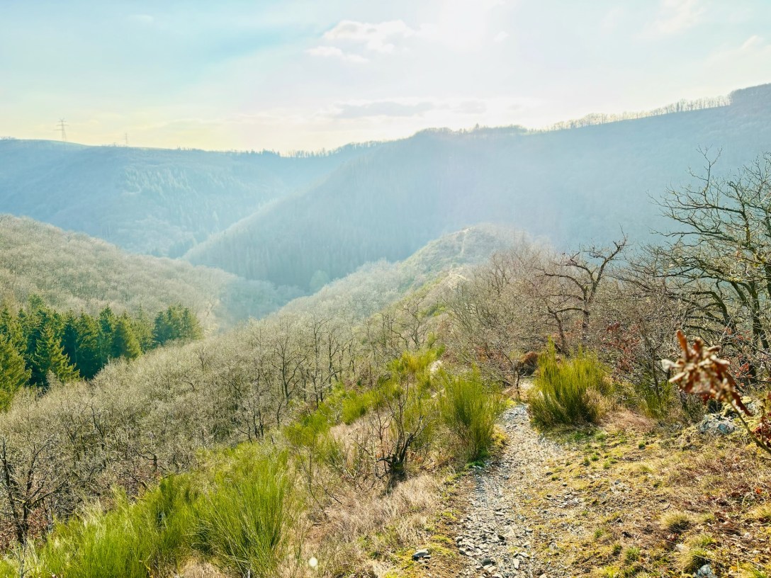And what a “push” the Molberlee is! It may be just over 600 metres long, but, my goodness, this is arguably the best half-kilometre of hiking trail anywhere in Luxembourg. The comfortable world of forest and streams seemingly disappears under your feet, leaving only an exposed, narrow slate ridge and wind-beaten bushes for company. Upwards you climb, quickly, towards the level of the surrounding hills, rising brutally some 140 metres at an average gradient of well over 20%.
