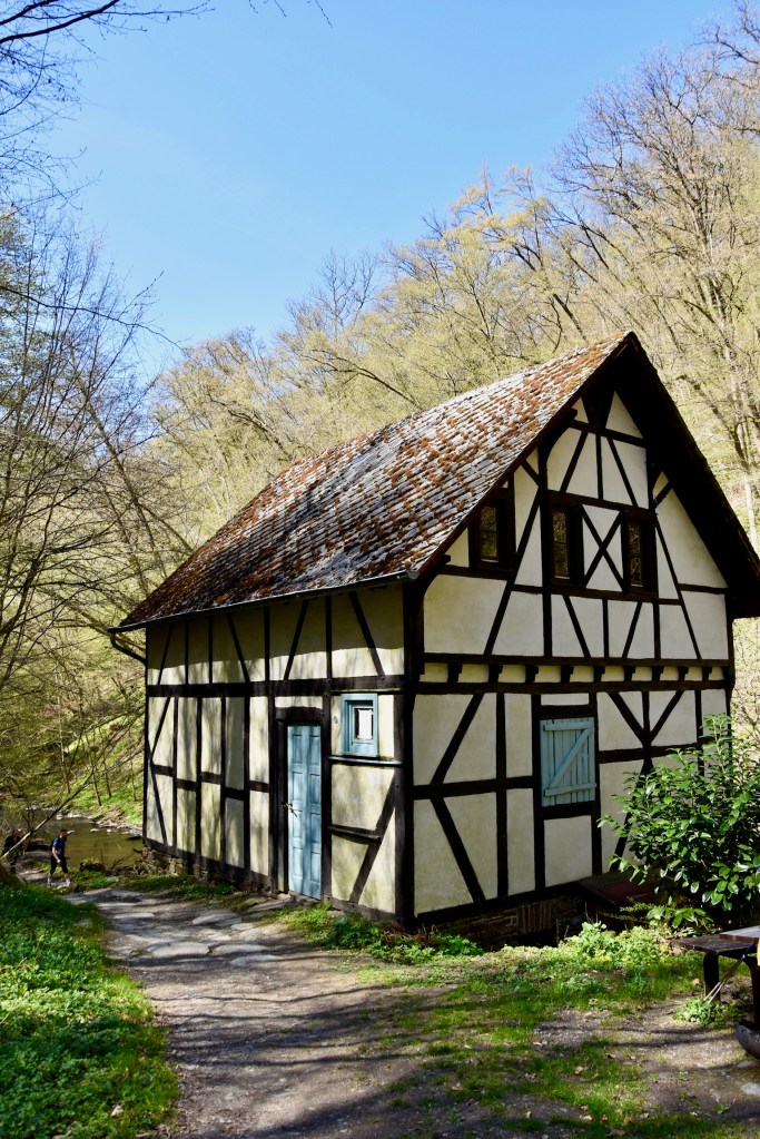 From the hamlet of Steffenshof the trail dives down into the forest once again, and this is where the “Erlebnispunkte” for scenic beauty really start to stack up. A long section along the Baybach Valley takes the hikers alongside an idyllic stream, past waterfalls, historical slate mines, water mills and information boards about local history and legends. More difficult sections are traversed using a system of guiding ropes, the excitement of which sends that Erlebnispunkte score skyrocketing.
