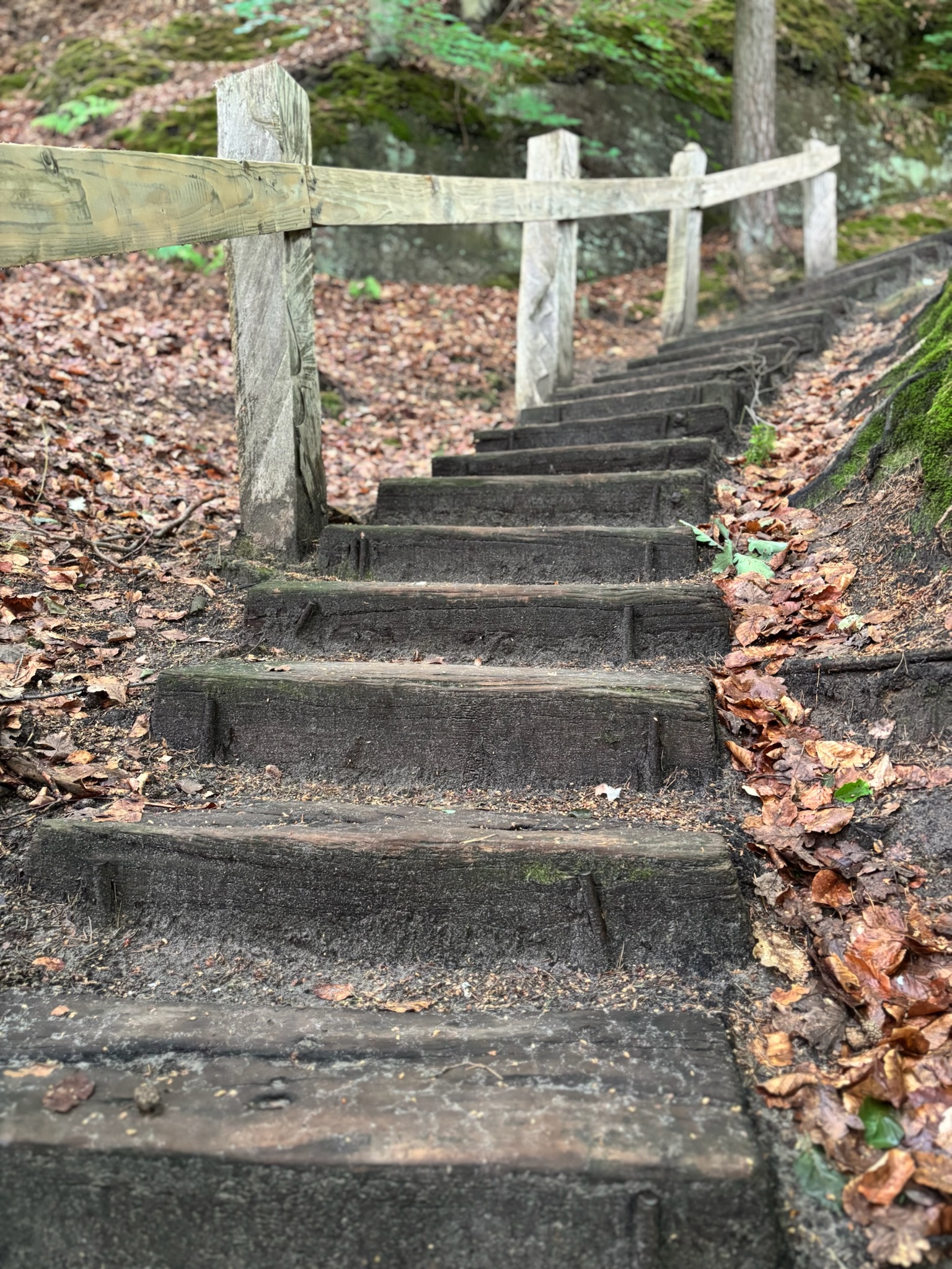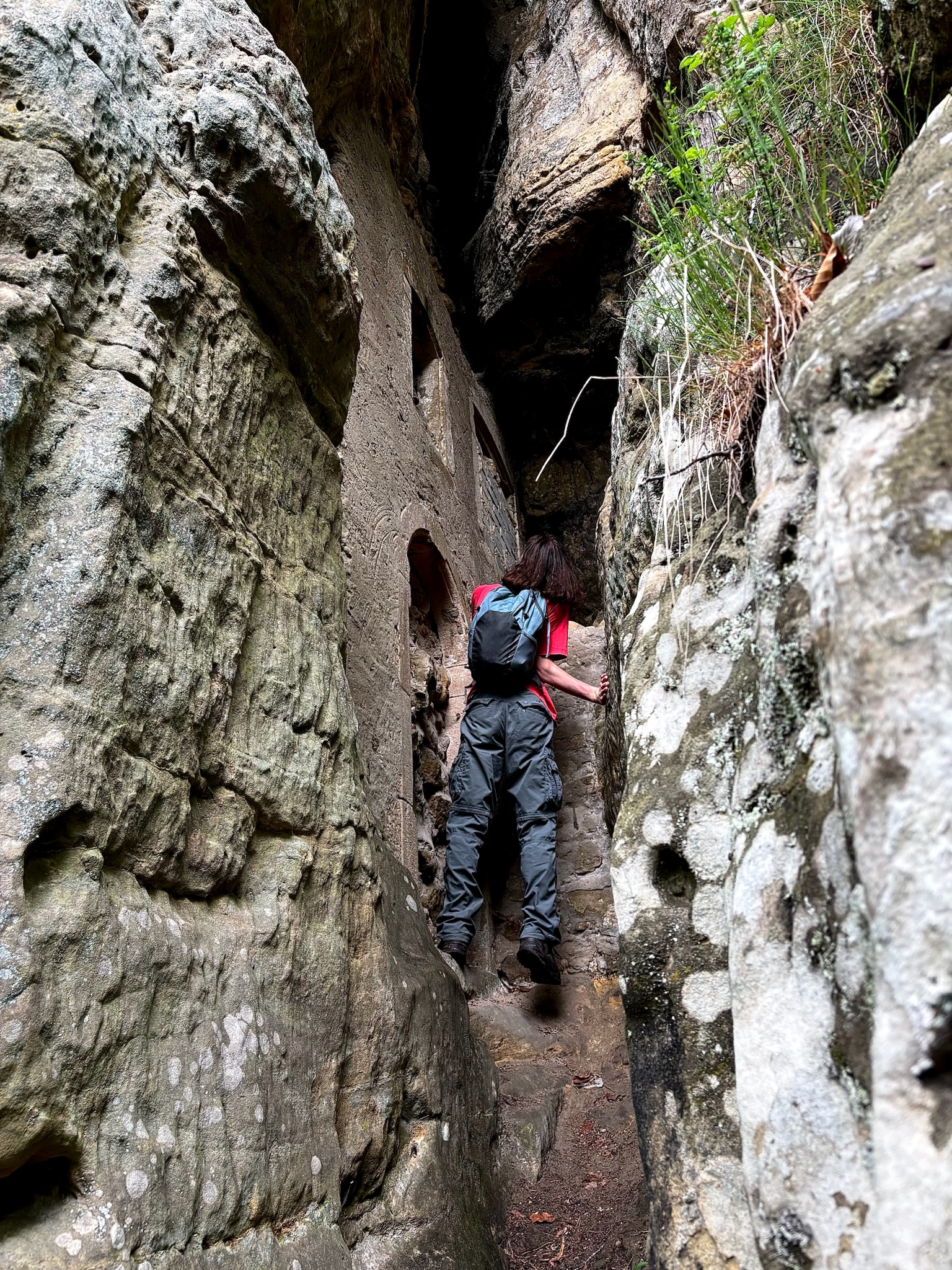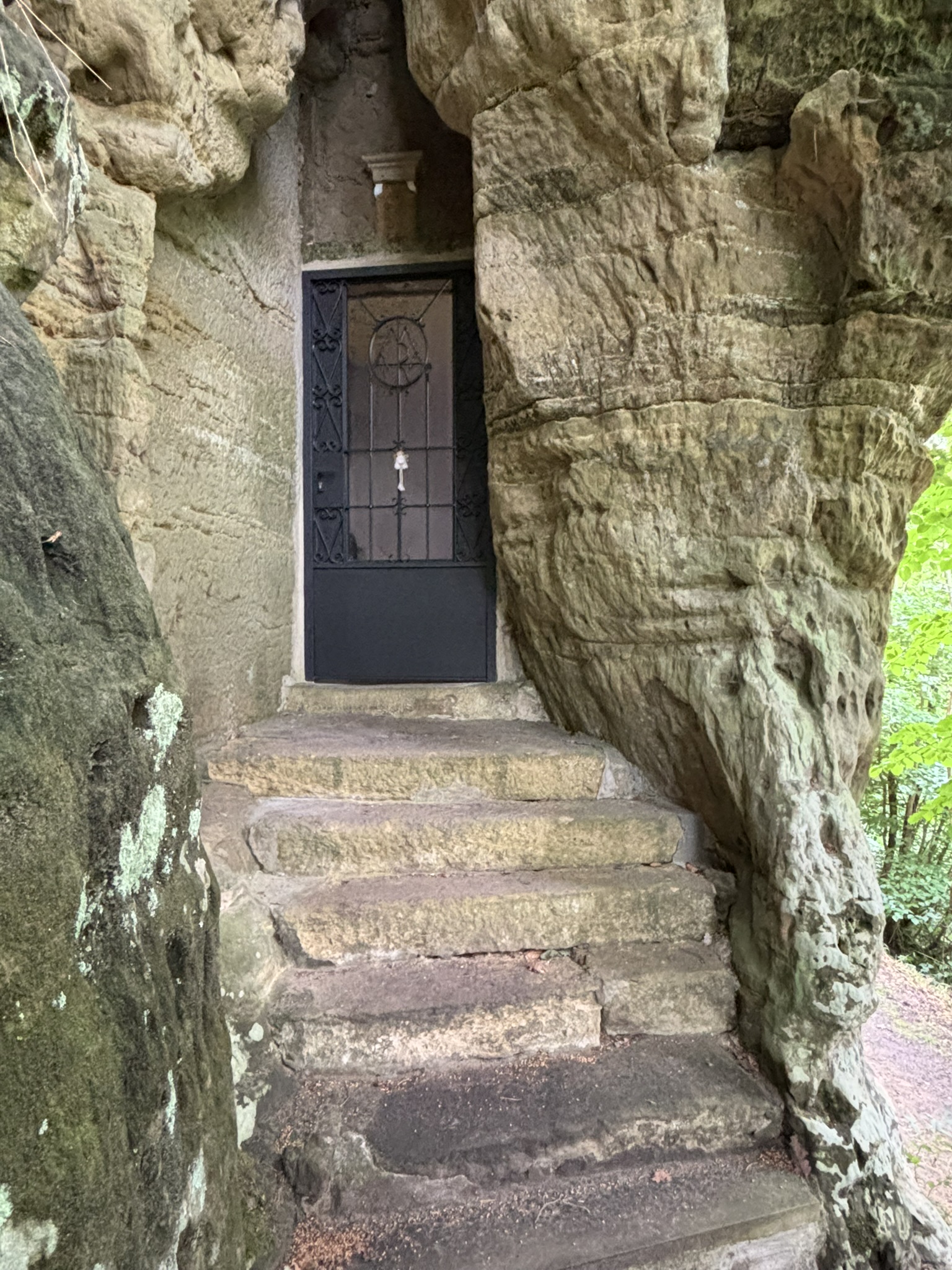 The trail is named after the Fautelfiels chapel, a stone-carved place of worship hidden in a vertical cleft in the rock. There’s a “main” entrance too: a small, dark metal door reachable by steep, time-worn stone steps, somewhat improbably framed by classic Luxembourg sandstone rocks. It looks like the entrance to another world but, sadly, this portal door was locked tight. Consolation, though: if you go to the glass and squint you can just about see the plain benches of the interior, bathing in the green forest light streaming in from the only remaining window.