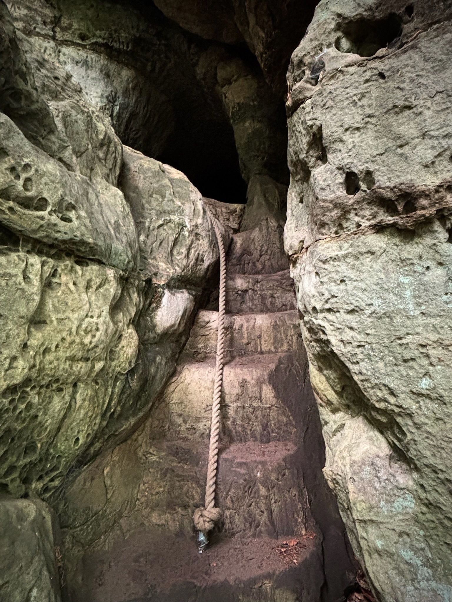 The chapel marks the beginning of the most exciting section of the trail, with a viewpoint over the Alzette valley and several mini-caves to explore, some just large enough to peek inside, others worth a careful scramble. Of these, the Gourmangslay is by far the most celebrated and beautiful: Carved steps and a thick rope anchored to the rock face lead upward into darkness, and the cave itself goes back even further we than dared to explore. For curious kids (and overgrown kids), this is the stuff of adventure and legend.