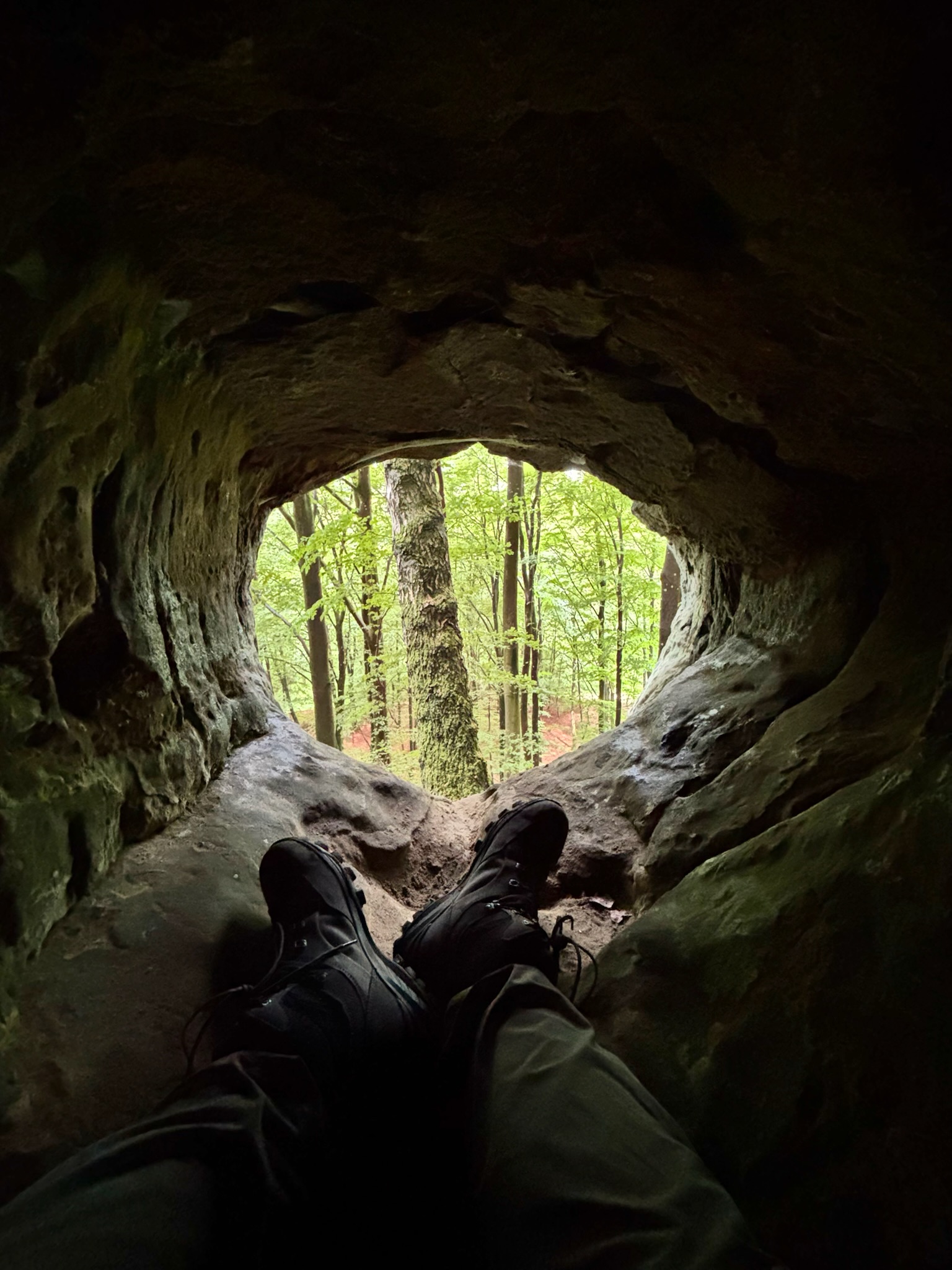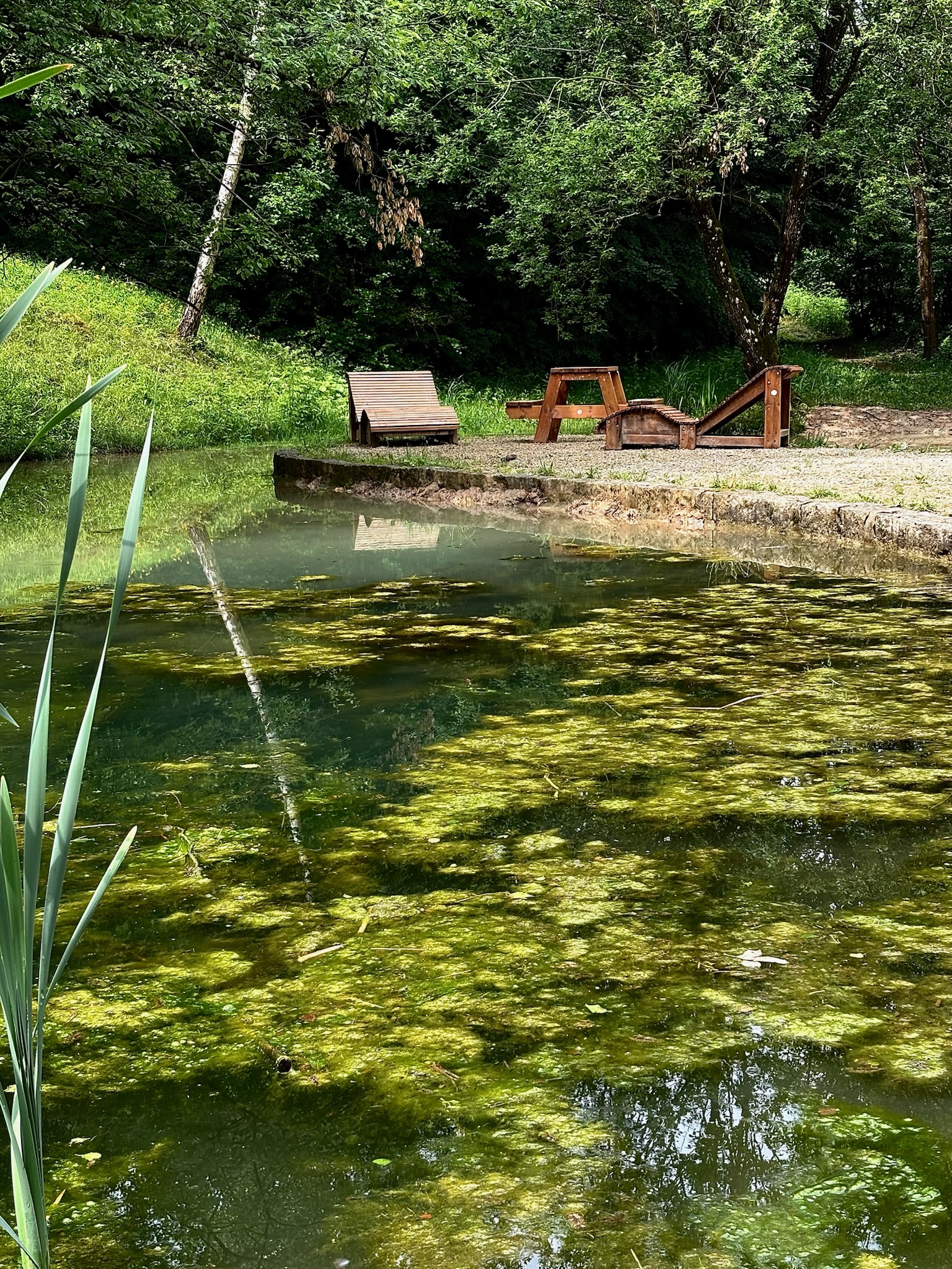 A little further on, and I clambered inside another cave: no room for the dog and teenage son in this one. I rested there a while, legs dangling above the forest floor, my subterranean view framing the woods like my very own secret diorama. From here the trail briefly dips down towards an algae-strewn pond and resting area (another feature of this trail is the quality and quantity of picnic tables and benches!) before climbing gently back up again towards the starting point.