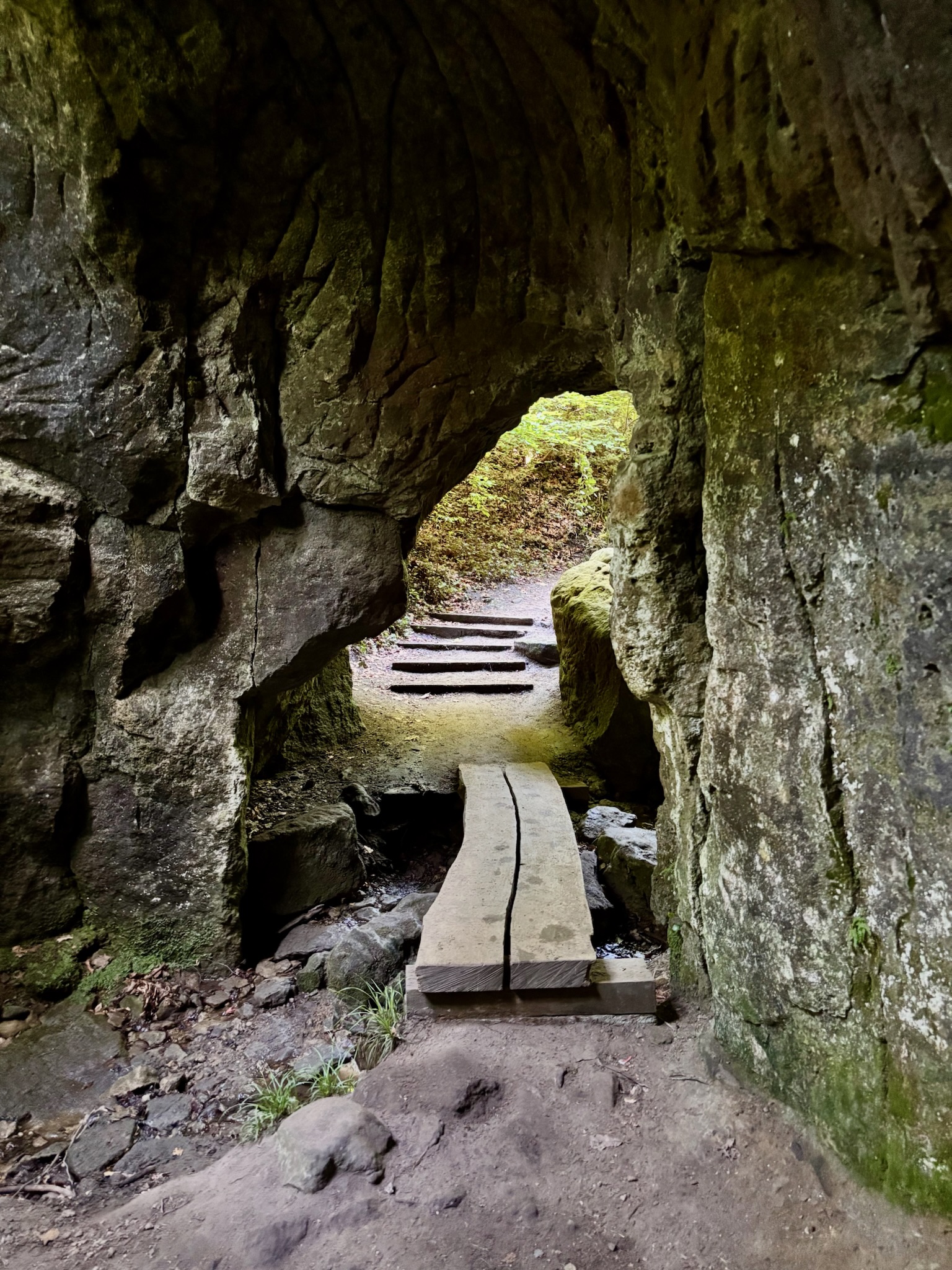 There’s something of a lull in the dramatic scenery immediately after the Hohllay, which brings with it the advantage of more peaceful footpaths and a return to the natural serenity of the forest. Indeed, the next highlight can be easily missed as it is not directly on the main E1 path at all, but a (signposted) 50m each-way diversion from it. But please don’t skip it: a visit to the Wëlkeschkummer is comfortably the best 100 metre investment you will ever make: