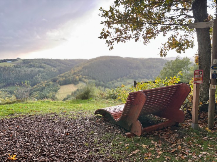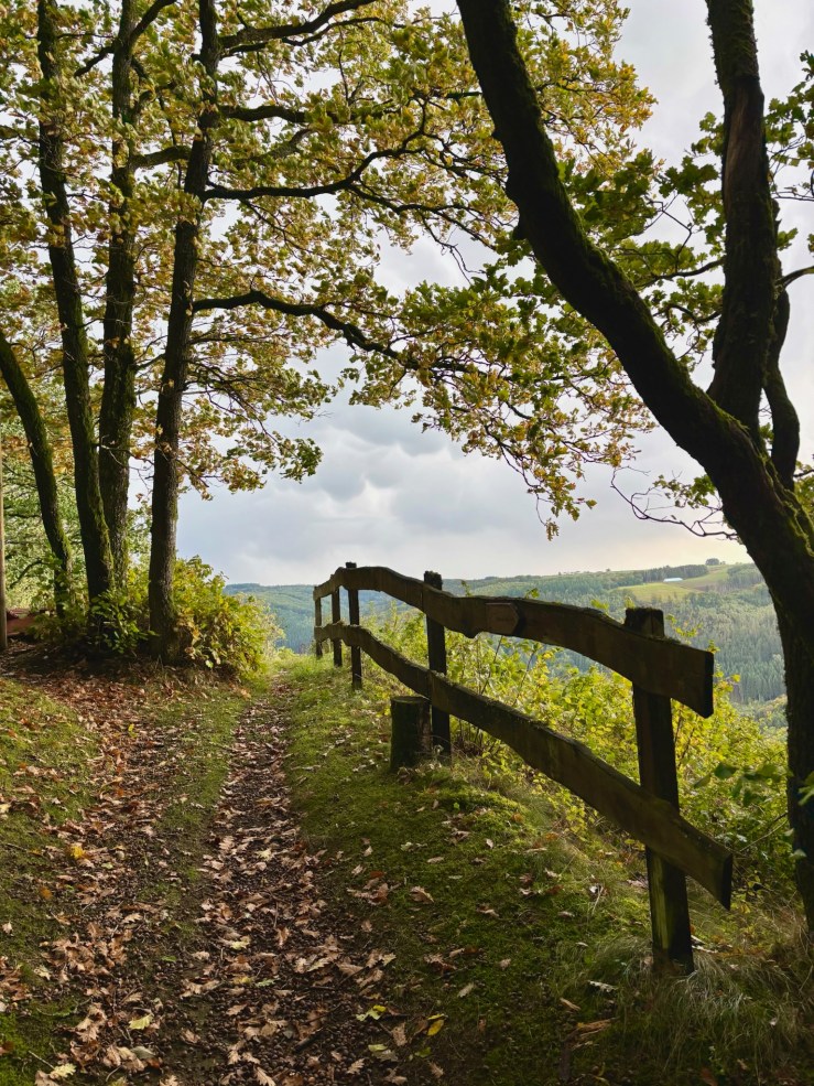 From the rain-soaked paths by the artworks at Bauscheltermillen, the trail rises slowly up along the south bank of the Upper Sûre, then crosses over at Bungerefermillen and climbs steeply up the north bank instead. The scenery, to this point, has been pleasant but unspectacular – think fields, forest and river – but, oh boy, is that about to change!