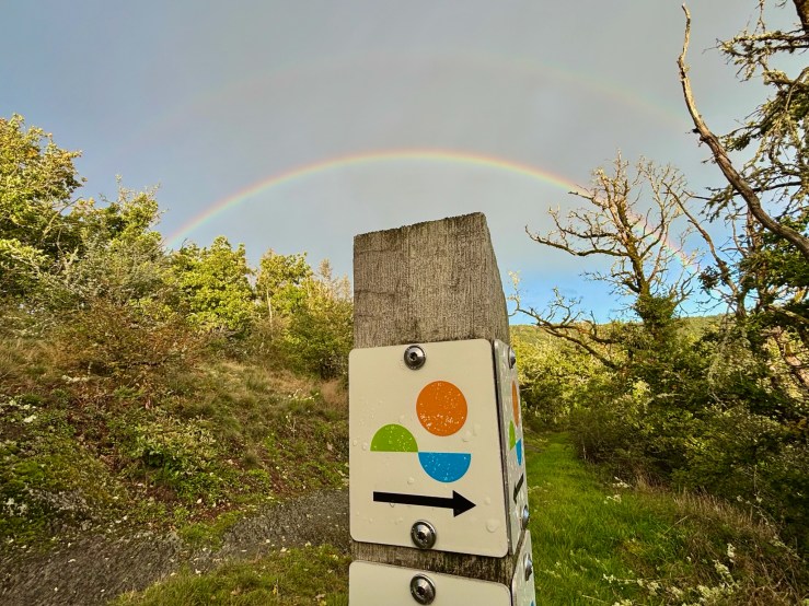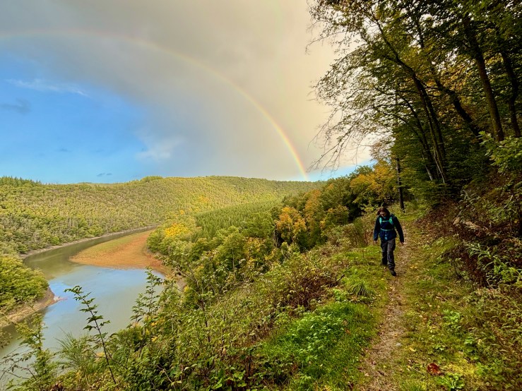 And, after that, another climb up to another valley ridge, this one offering perhaps the finest views of all. Below us, a convoy of ducks glided miles in perfect formation while above us, on this day that Luxembourg enthroned a new Grand-Duke, a rainbow crowned the golden-green hills of the Eislék. It was glorious.