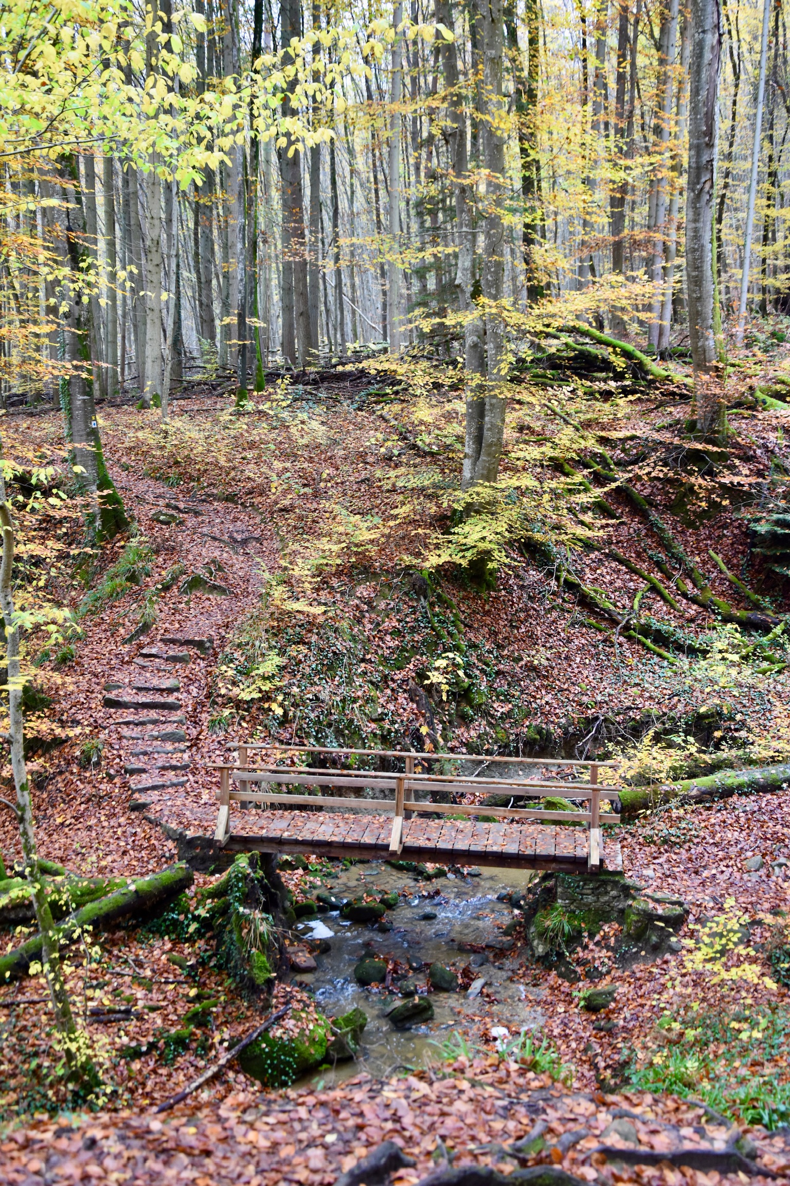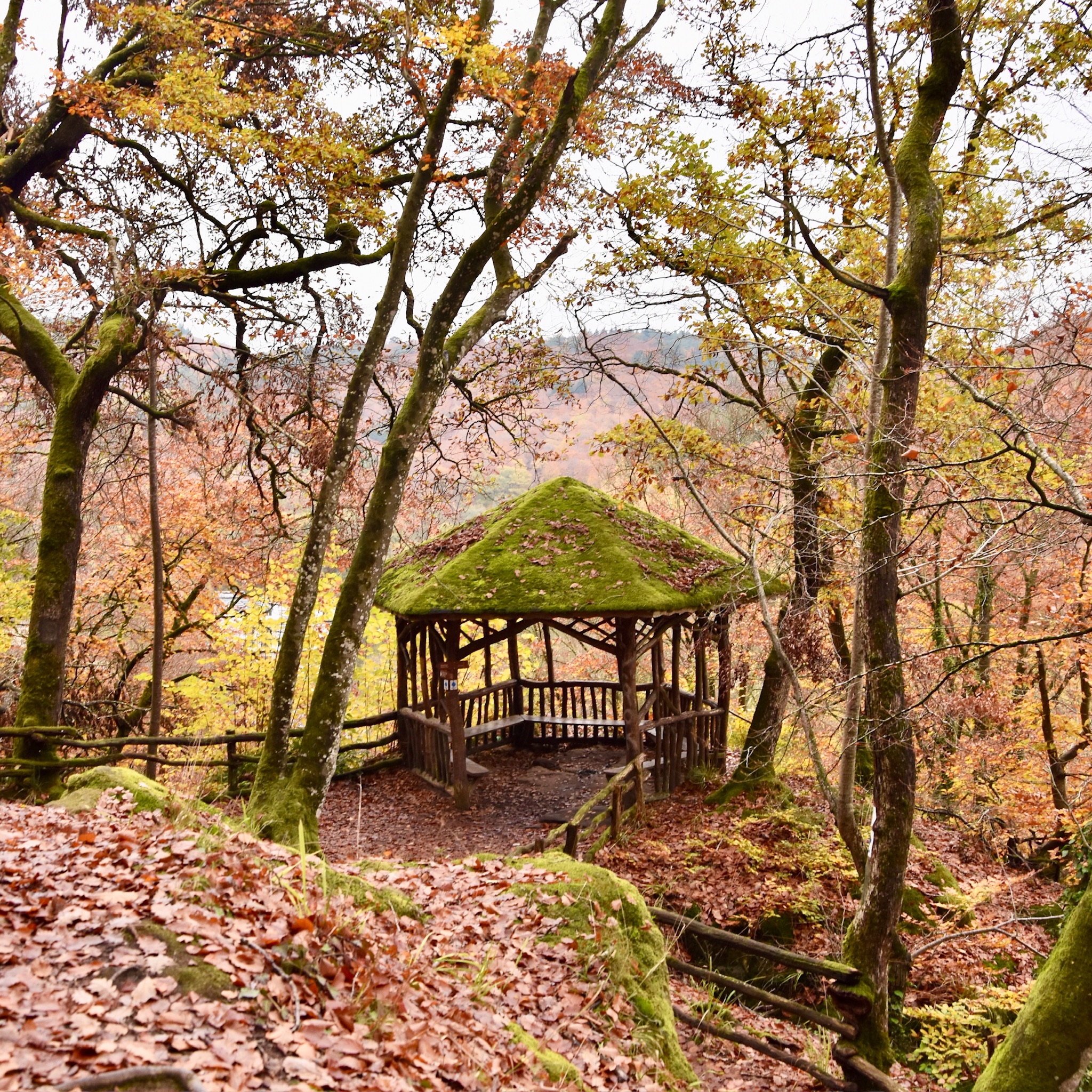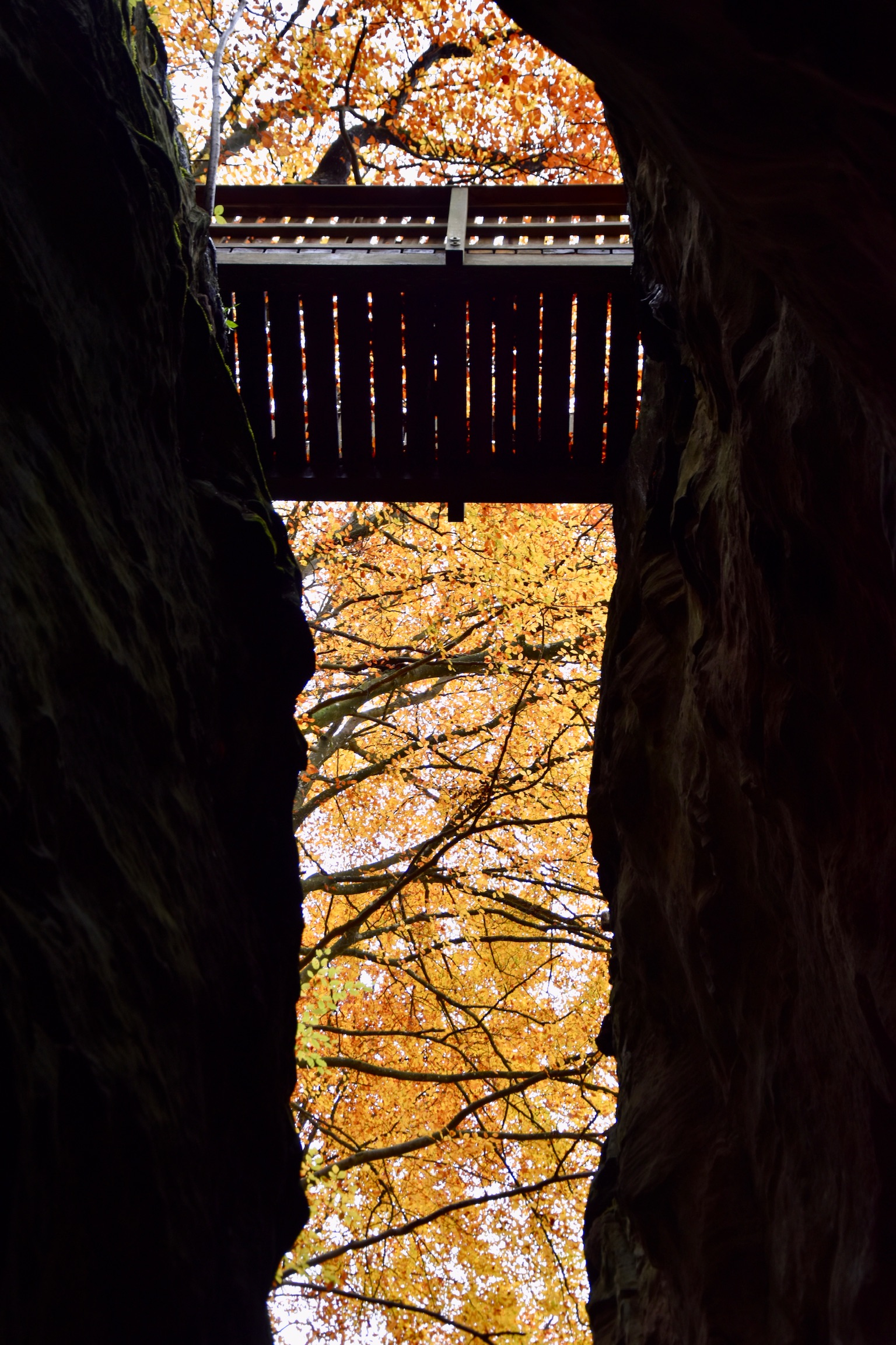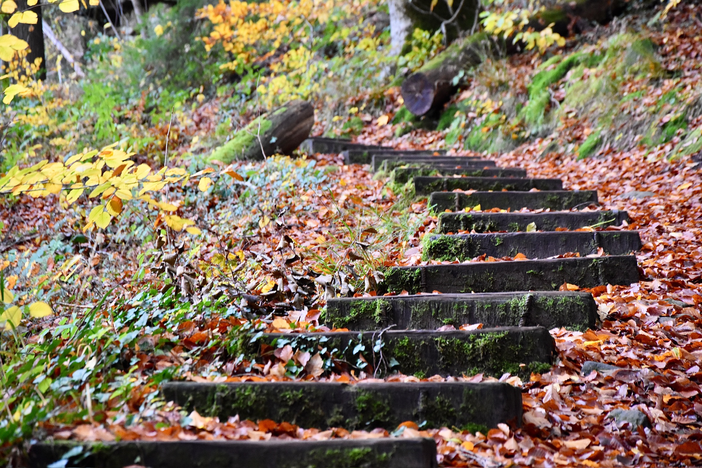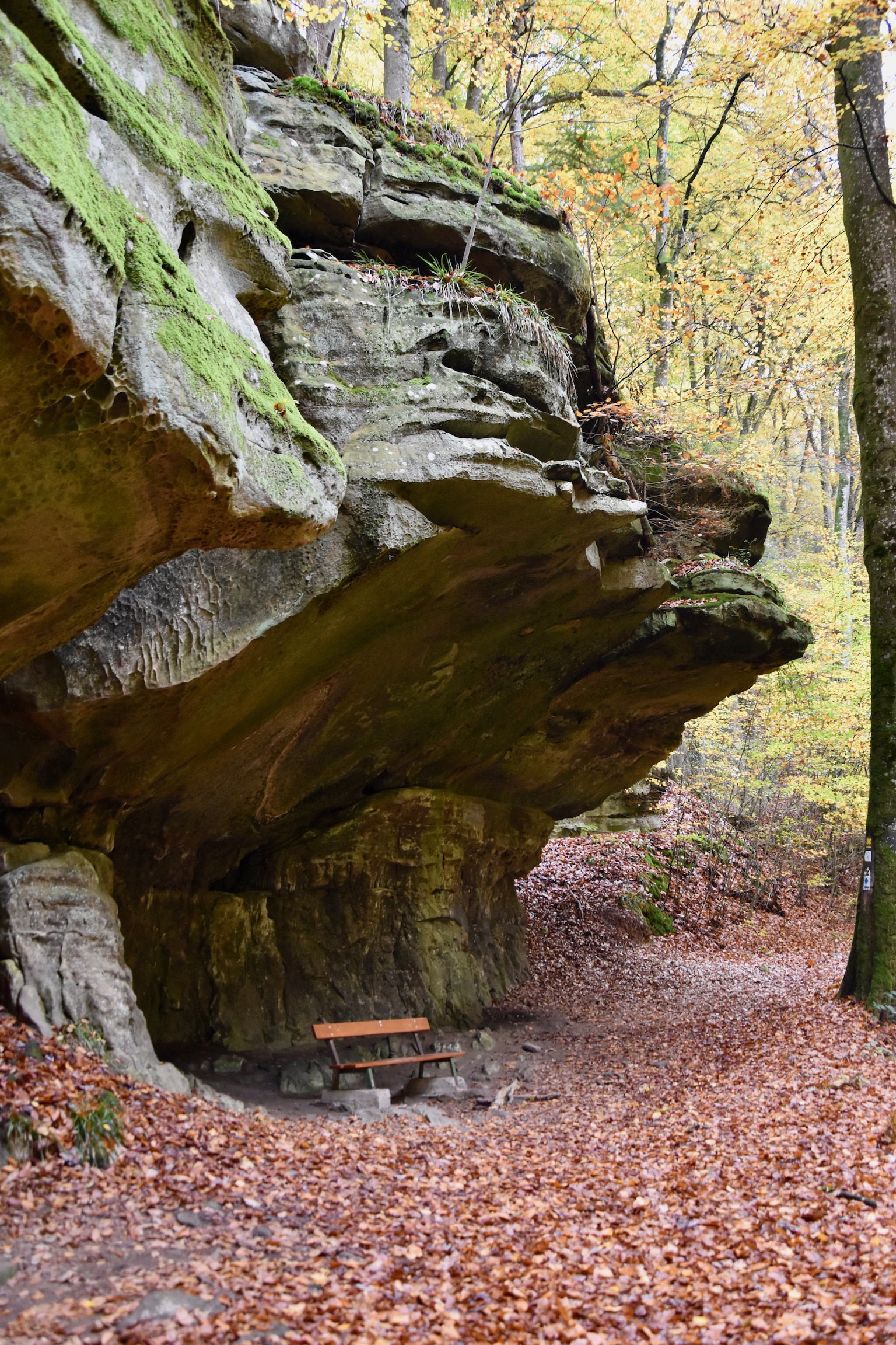 Perhaps another reason I chose this trail as my birthday treat was the challenge factor. A word of warning: do not underestimate this hike. It may “only” be 10 km with 200 metres of elevation gain, but there’s barely a flat section anywhere and it will feel more like 15km. You’ll be constantly weaving, climbing, and descending through the rocky terrain. Good footwear is essential, especially on wet autumn days when slick leaves coat the smooth stone and hide ankle-twisting roots beneath. Mud can also be an issue, particularly on the busier southern section shared with the Mullerthal Trail between the Schiessentümpel waterfall and the Kuelscheier dark passages – a popular route for day hikers.
