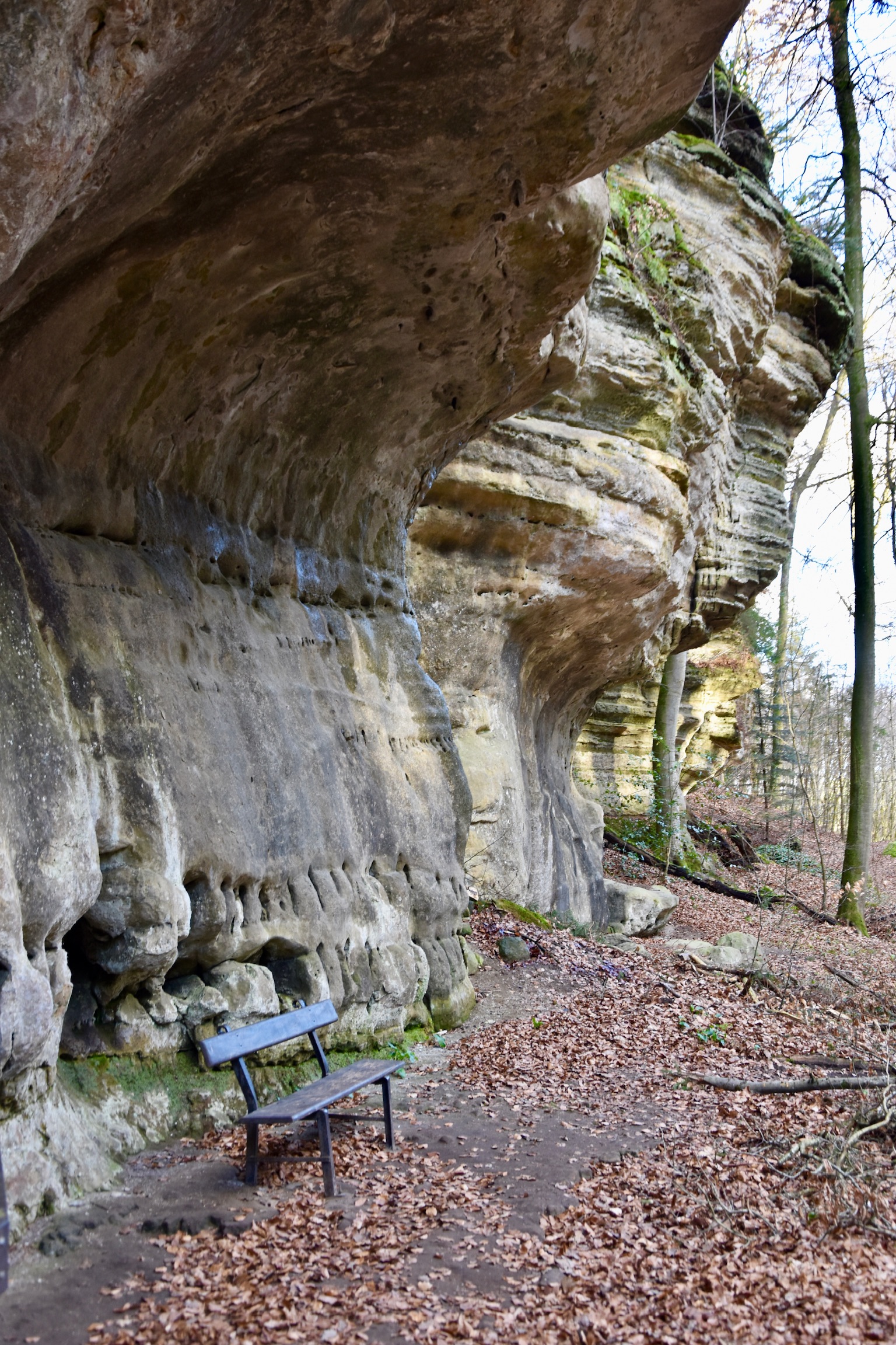 You’re over halfway round the loop by now, and still no sign of the famous Mullerthal rocky scenery. All that changes as you descend from the Consdorf-Altrier plateau into picture-perfect Little Switzerland woodland. Babbling stream, towering beech trees, sandstone cliffs – it’s all here. Pay close attention and you’ll even find some neolithic rainures: mysterious grooves in boulders left by our distant ancestors (you can find more on the brilliant B1 Beaufort hike, either side of the château).