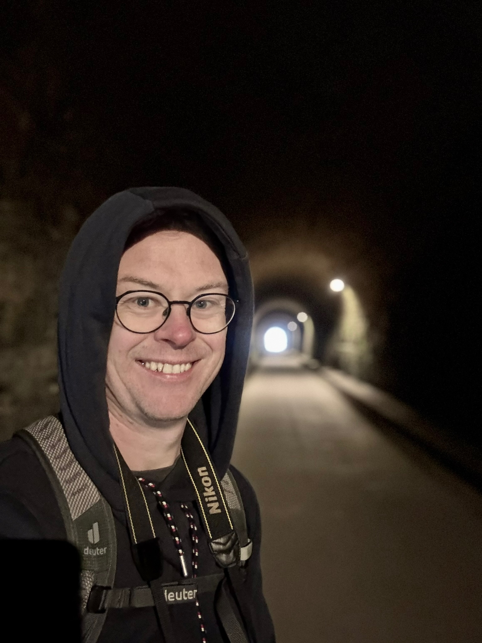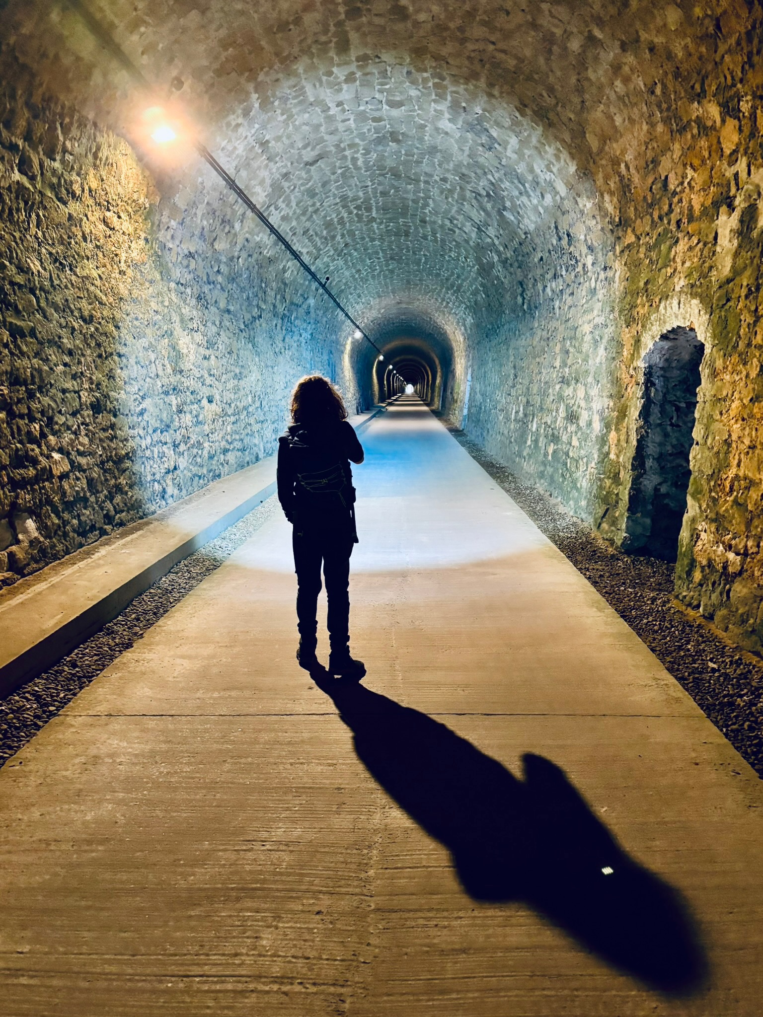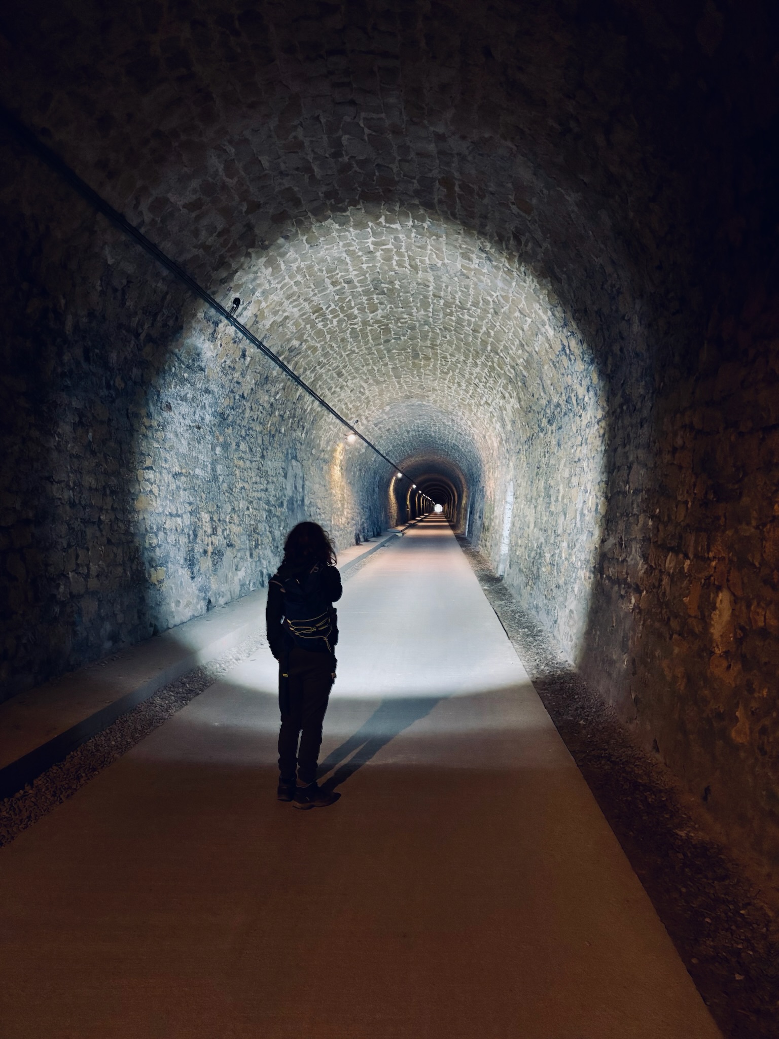 After decades of silence, the old railway line was gradually reclaimed as a walking and cycling route. As far as my research suggests, there was no grand reopening; the tunnel simply re-emerged organically over time as part of a growing network of local paths. Lighting and asphalt were added later, making it easy to walk or cycle through while preserving its cold, echoing atmosphere.